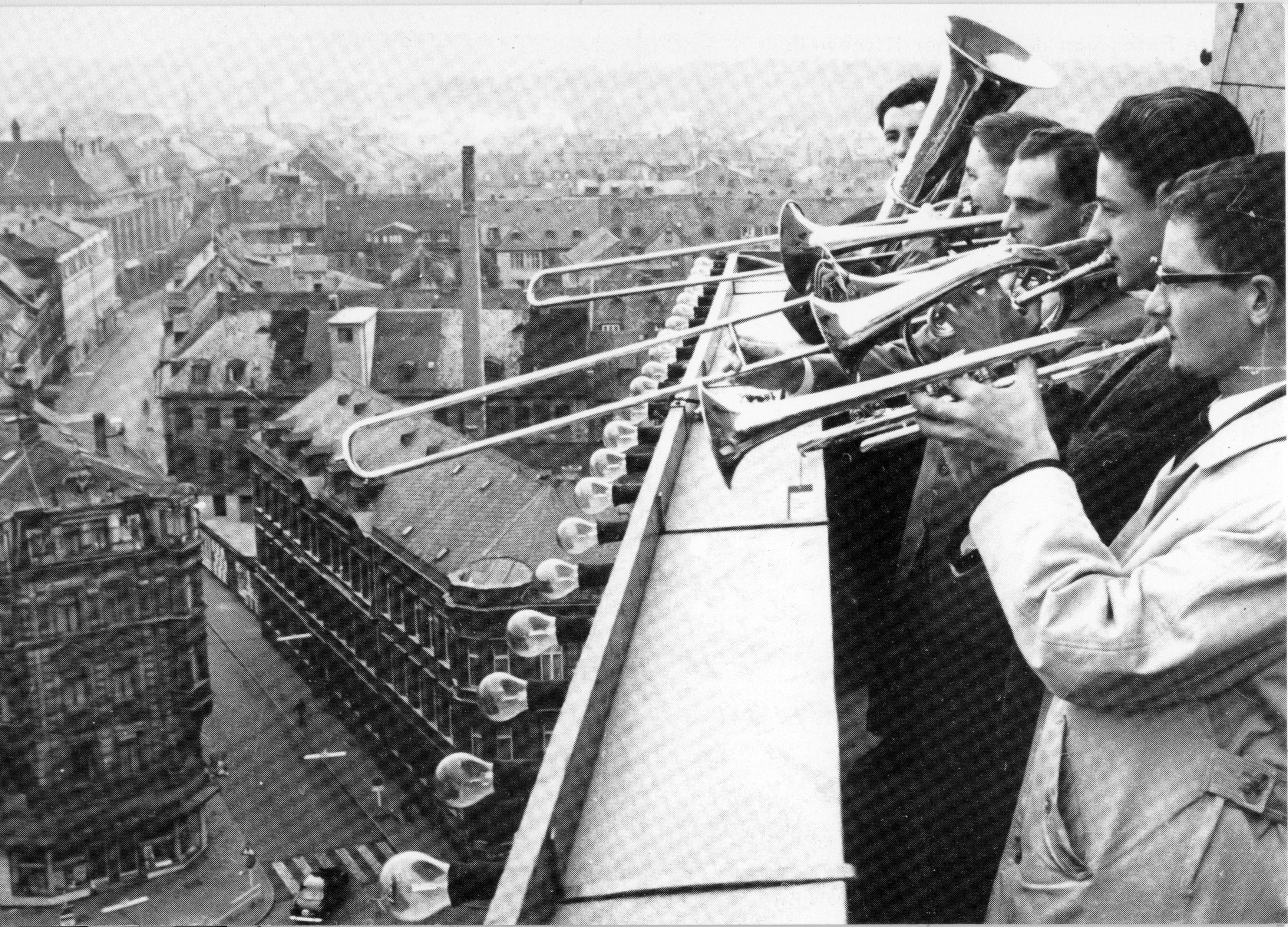 | Beschreibung | Kirchweih, Posaunenchor des CVJM auf dem Rathausturm, 1964 | ||