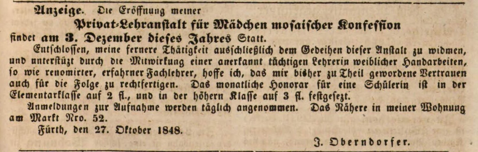 BeschreibungPrivat-Lehranstalt für Mädchen, Fürther Tagblatt 28.10.1848