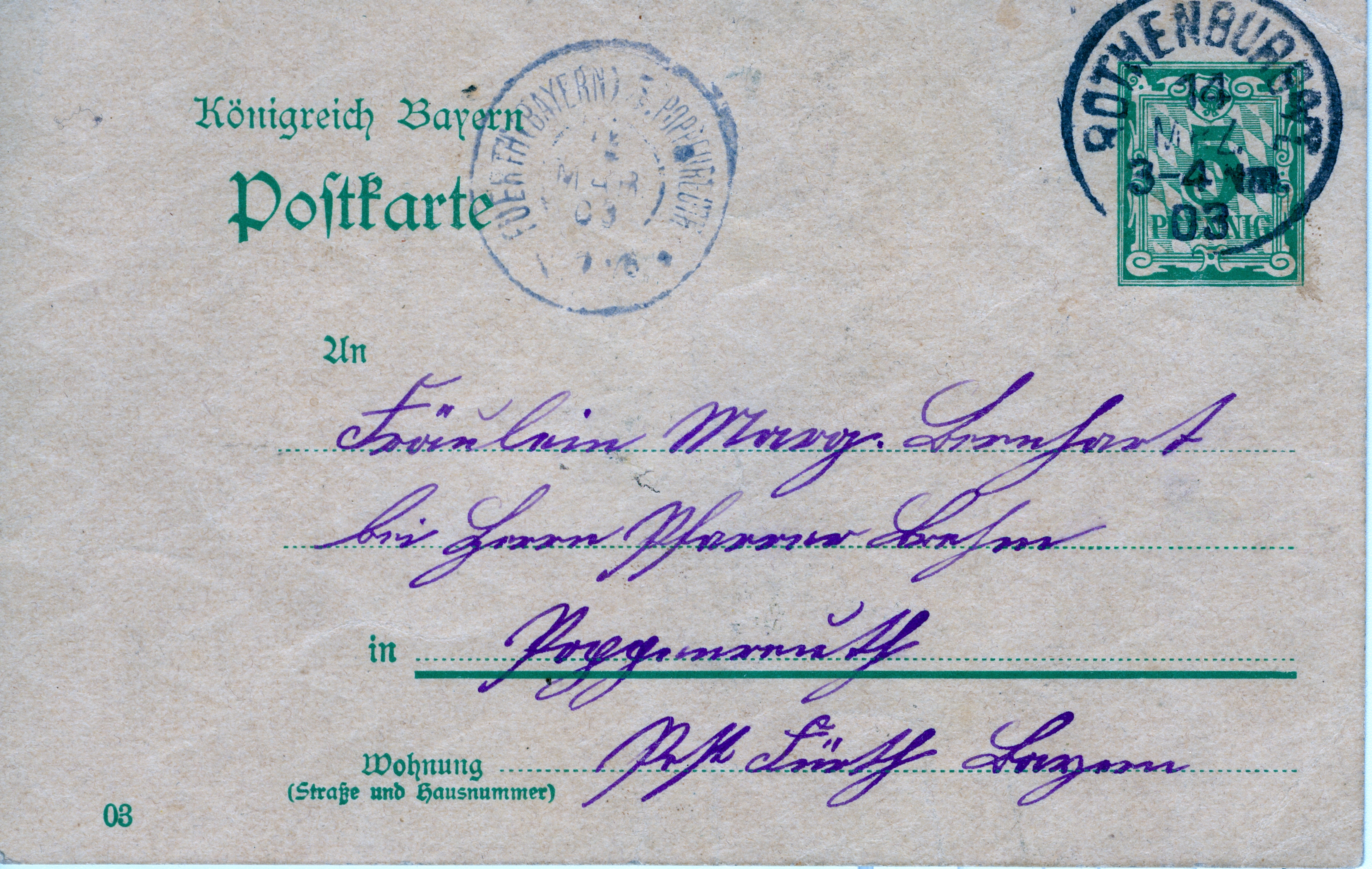 | Dateiinfo (Bild-Unterschrift und Info-Box, automatisch erstellt) | Karte an die Pfarrersmagd Margareta Bernhart Urheber: Friedrich Bernhart<br>Erstellungsdatum: 14. März 1903<br>Lizenz: cc-by-sa-3.0 | ||