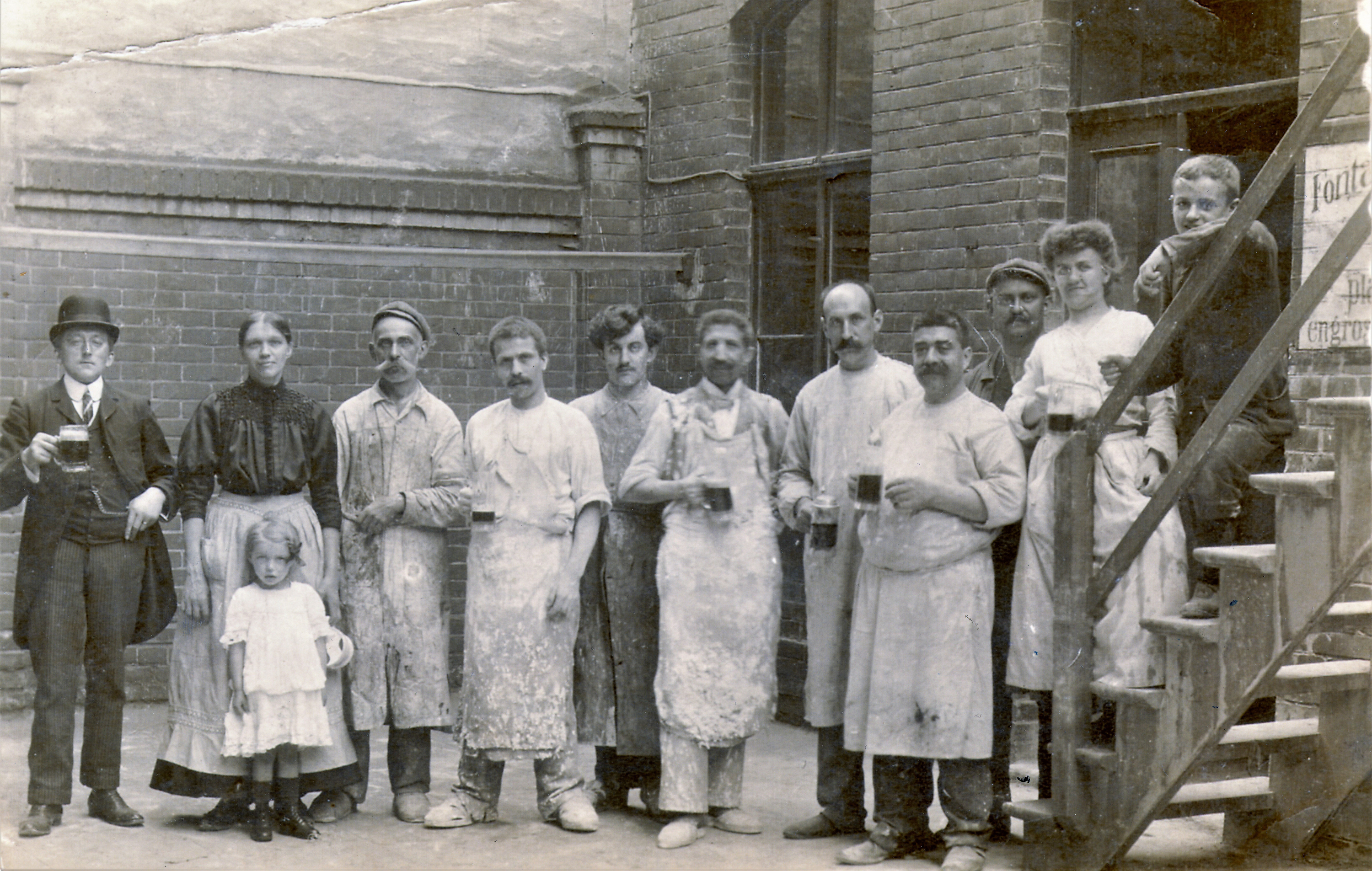 Mulini (Dritter von rechts) als Arbeiter in Berlin bei Fa. Irrgang. Um 1910 Urheber: Famlilie Mulini<br>Lizenz: cc-by-sa-3.0