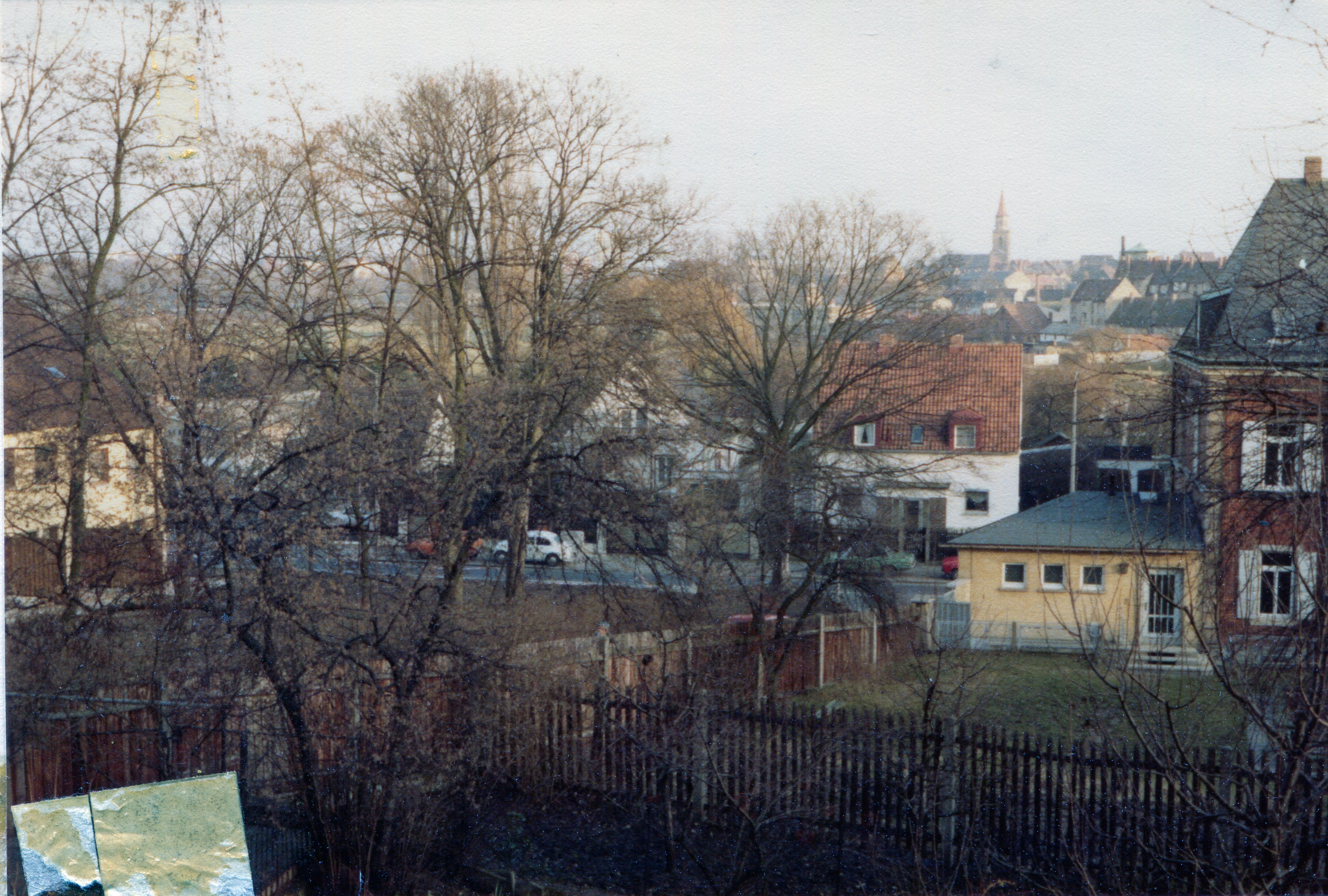 | Beschreibung | Blick zur Vacher Straße, Dez. 1979 – im Hintergrund Kirche St. Michael, rechts Gebäude Kindergarten Kindervilla St. Martin | ||