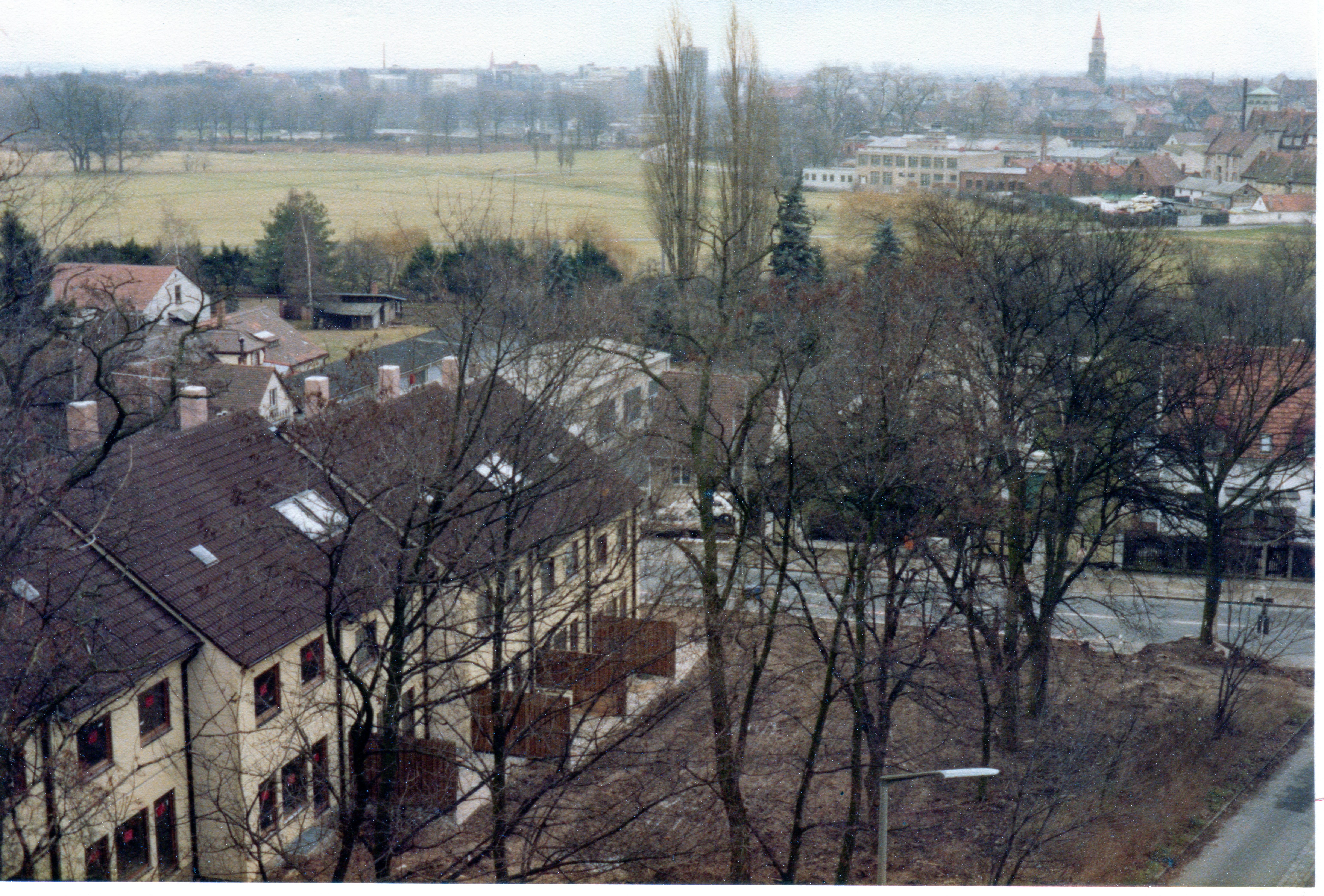 | Beschreibung | Blick über die vorderen fast fertigen Reihenhäuser an der Ecke Vacher Straße und Jakob-Henle-Straße im Dezember 1979. Das Eckteil der alten Sandsteinmauer und einige große Bäume sind verschwunden. | ||