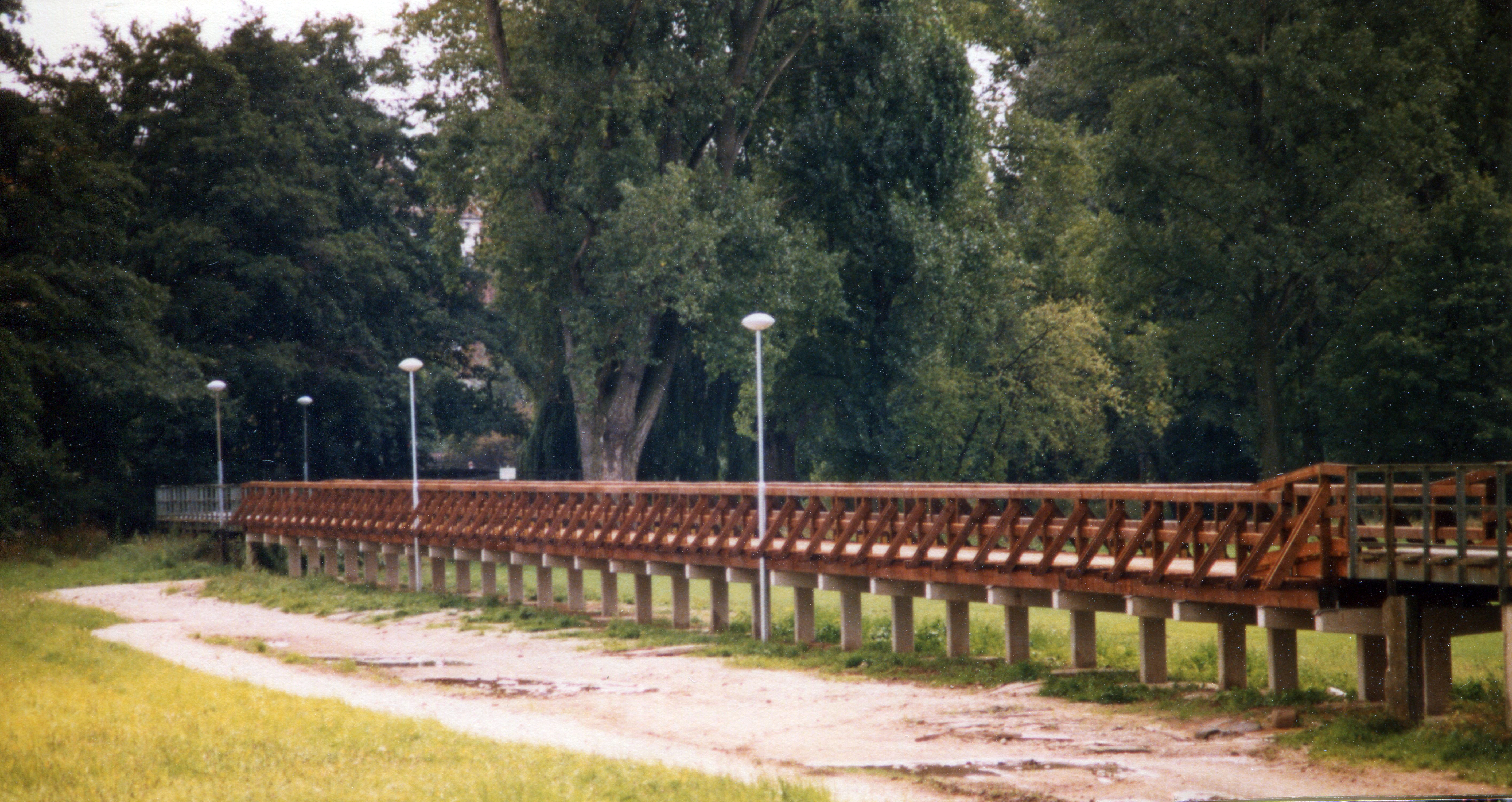 | Beschreibung | Im August mit Betonfertigteilen und Holzkonstruktion neu erstellter Hardsteg, Sept. 1986. | ||