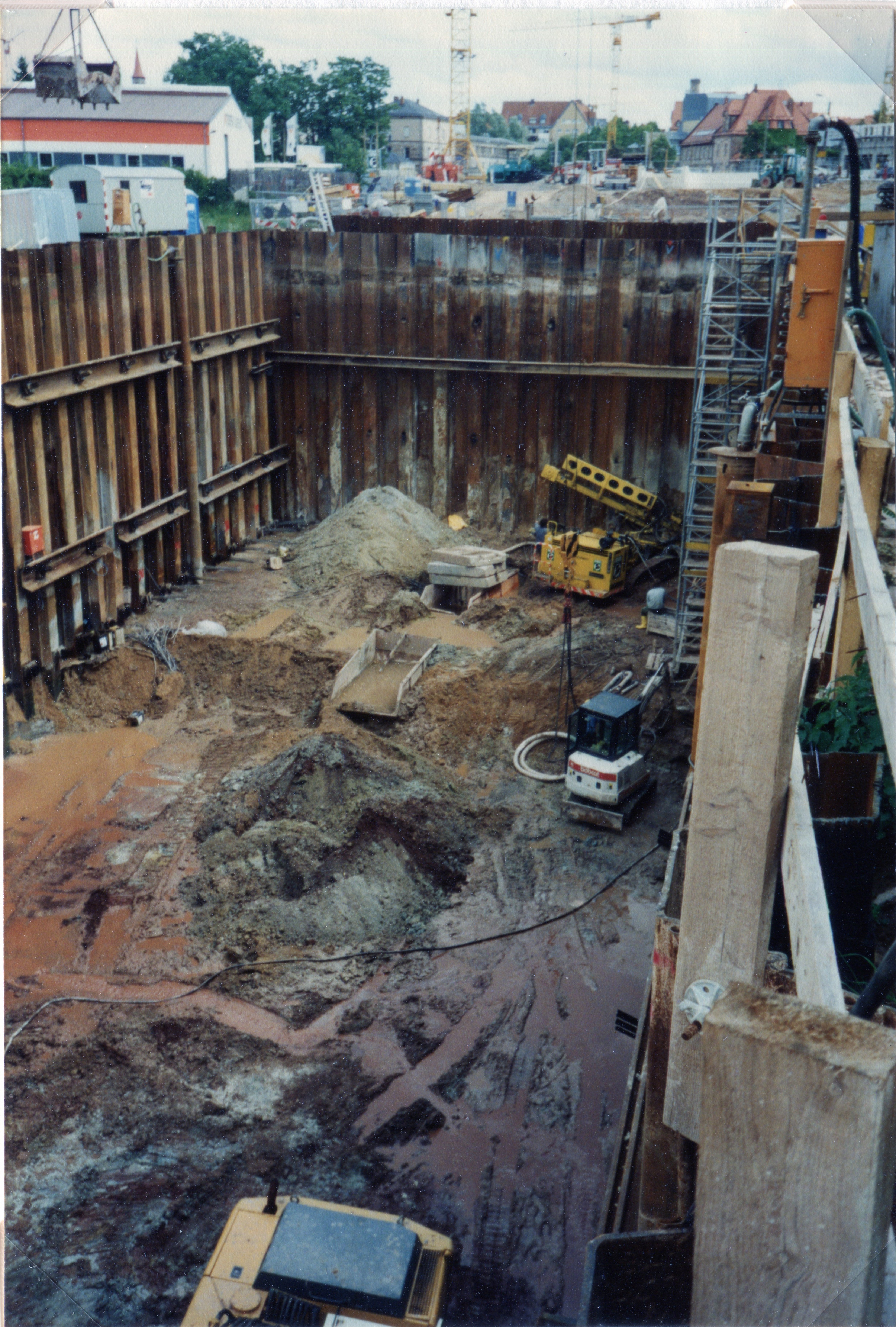 | Beschreibung | Bauarbeiten und Baugrube U-Bahnhof Stadthalle Blickrichtung Kulturforum im Juli 1996 | ||