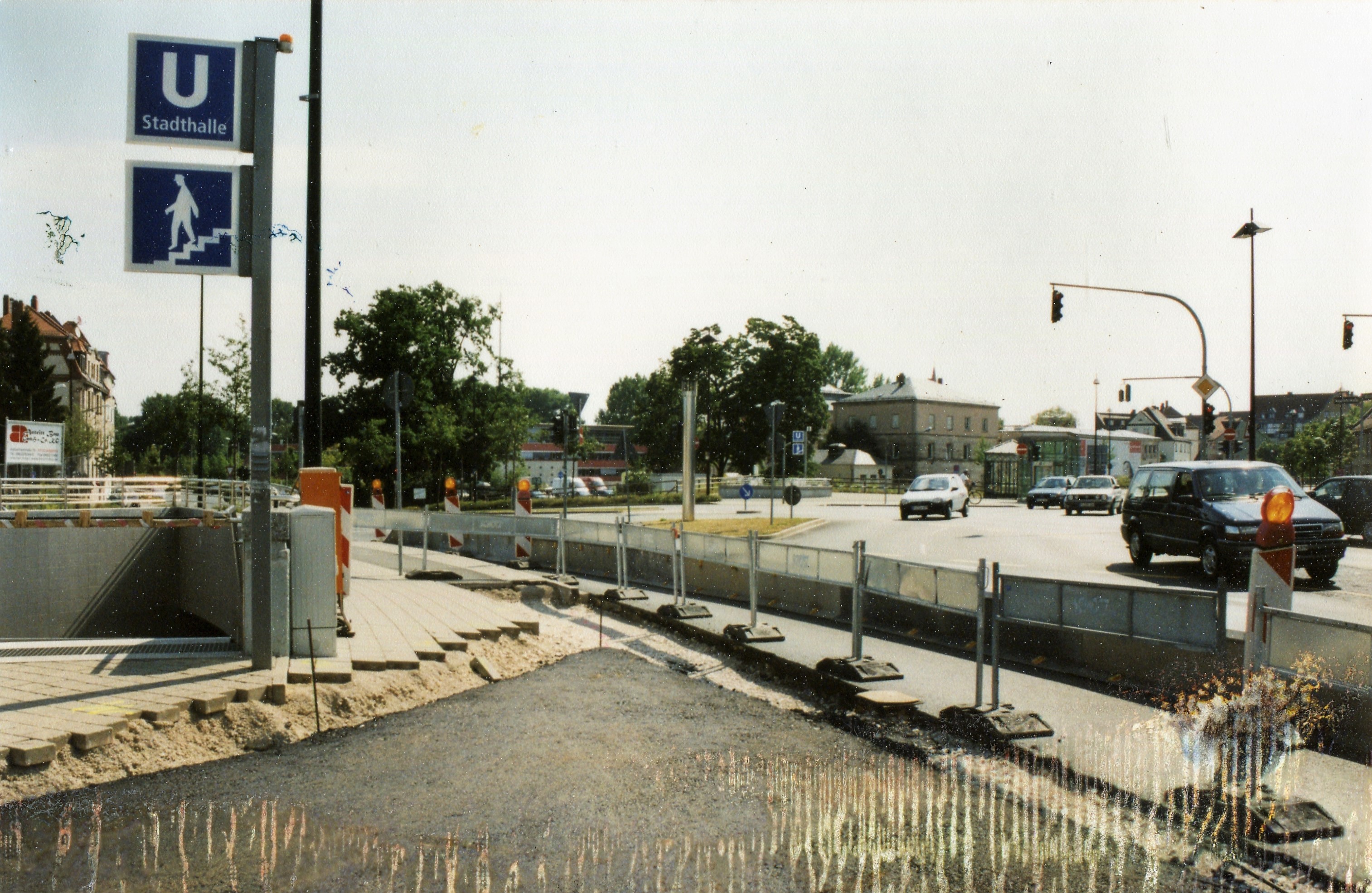 provisorische Straße zur Behelfsbrücke (Holzkonstruktion) im Wiesengrund neben der Flutbrücke, deren ... provisorische Straße zur Behelfsbrücke (Holzkonstruktion) im Wiesengrund neben der Flutbrücke, deren Abriss im August erfolgte, Blickrichtung Kapellenstraße und Kulturforum im Juli 2003<br>Urheber: Klaus-Peter Schaack<br>Erstellungsdatum: 27. Juli 2003<br>Lizenz: cc-by-sa-3.0