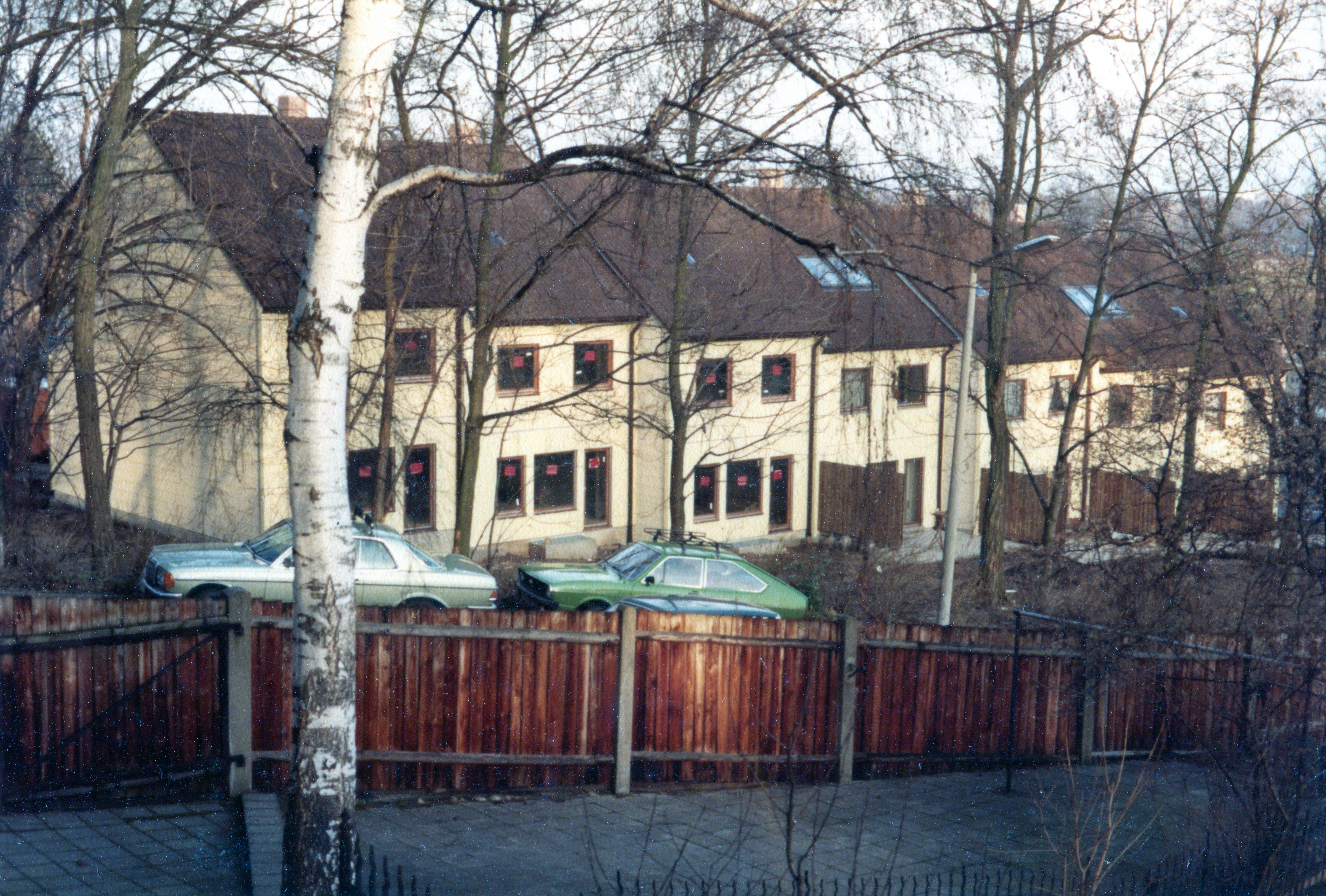 | Beschreibung | Blick auf die fast fertigen sieben Reihenhäuser Vacher Straße 25-25f. Im Vordergrund mit geparkten Autos die Jakob-Henle-Straße im Dezember 1979. | ||