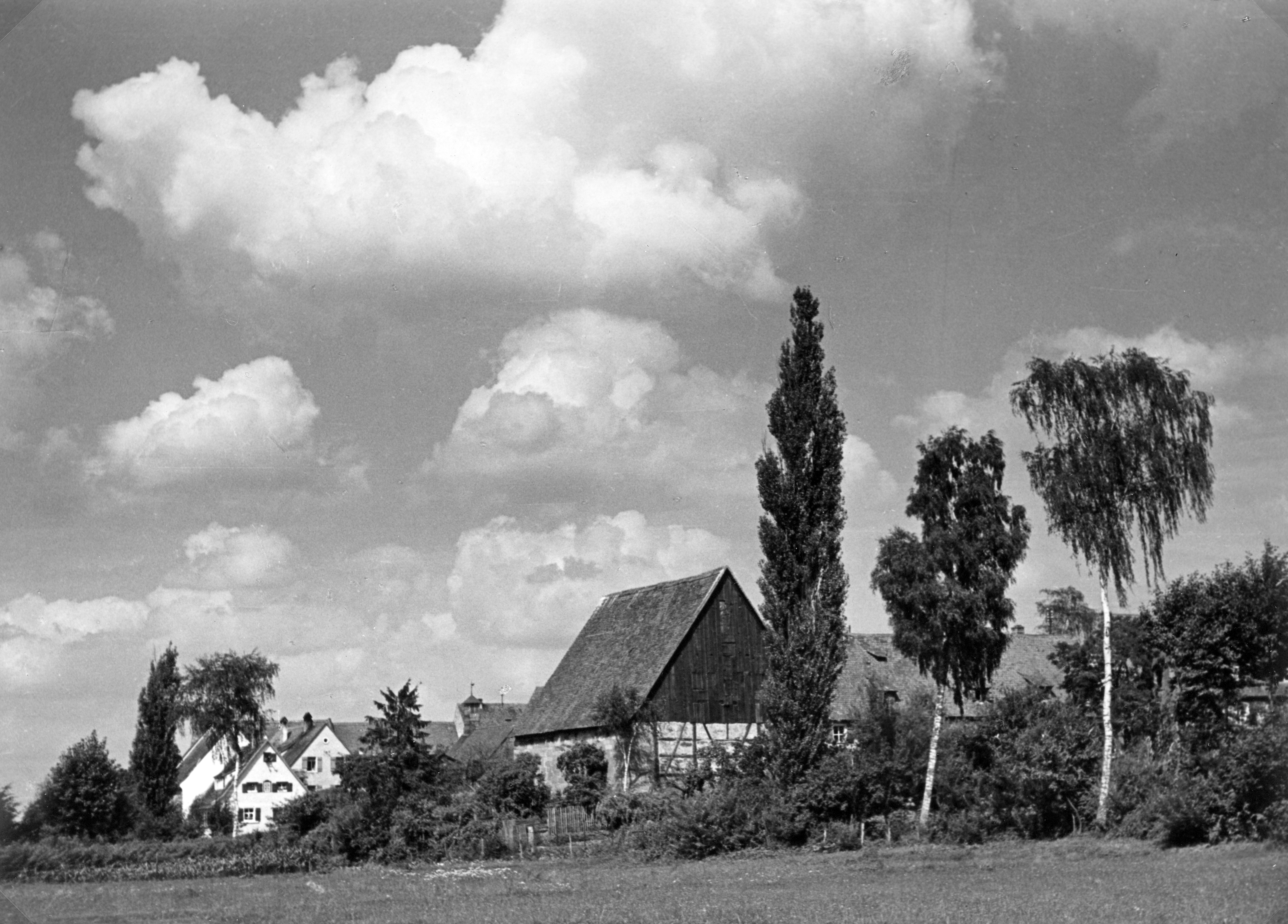| Beschreibung | Blick vom Wiesengrund nach Stadeln, Bildmitte die alte Scheune von Fritz Muggenhöfer, 1935 | ||
