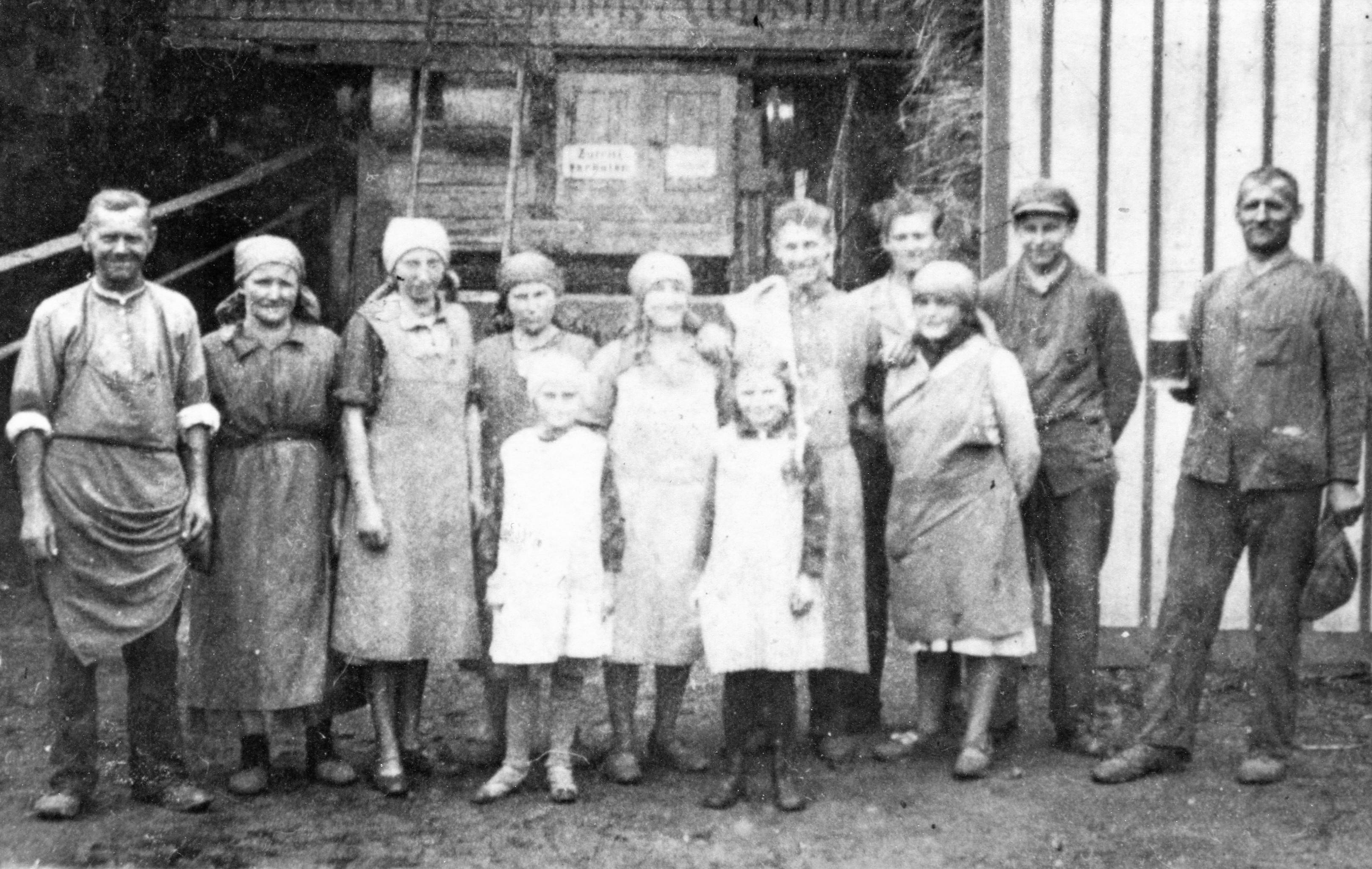 | Beschreibung | Dreschgemeinschaft im Kessler Hof in Stadeln vor dem 2. Weltkrieg, vl. Andreas Kessler, Ursula Kessler, Marie Derbfuß, unbekannt, Marga Barthel, geb. Grieß, Frau Leipold, geb. Ulrich, Lona Naumann, geb. Ammon, Michael Kessler, Margarethe Gräf, geb. Ulrich, unbekannt, Dreschmaschinenführer Beck aus Sack | ||