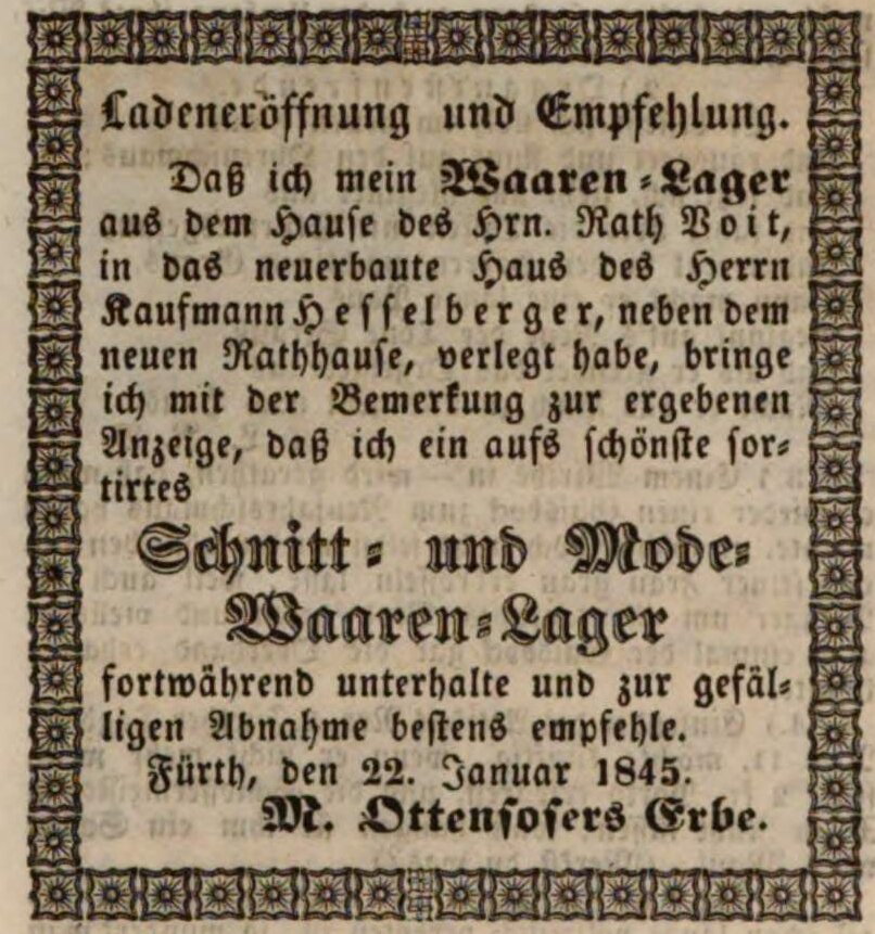 | Dateiinfo (Bild-Unterschrift und Info-Box, automatisch erstellt) | Anzeige Geschäftseröffnung Ottensoser, Fürther Tagblatt 24.1.1845 Urheber: Fürther Tagblatt<br>Erstellungsdatum: 24. Januar 1845<br>Lizenz: noc-nc-1.0 | ||