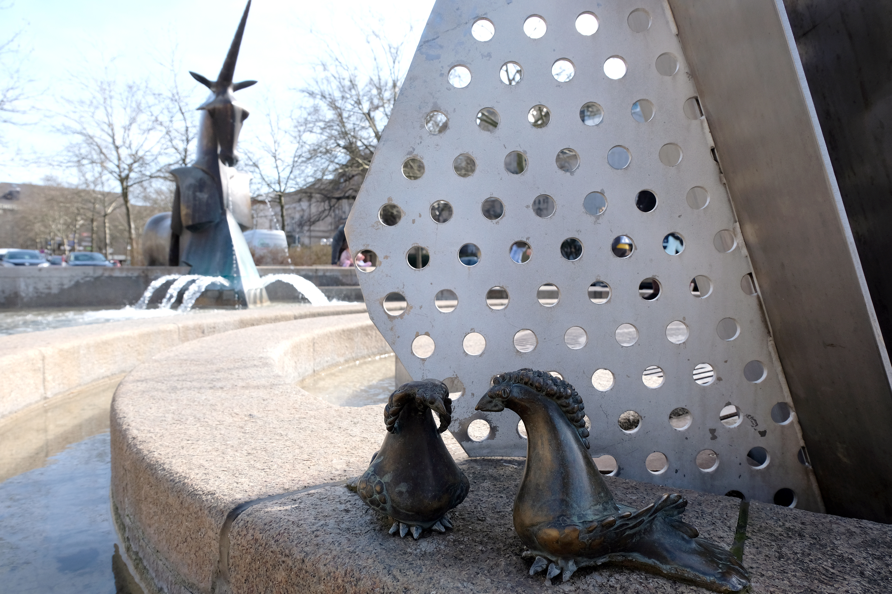 | Beschreibung | Details vom Paradiesbrunnen, Taubenpaar neben dem Regenbogen, an der Dr.-Max-Grundig-Anlage, 2018 | ||