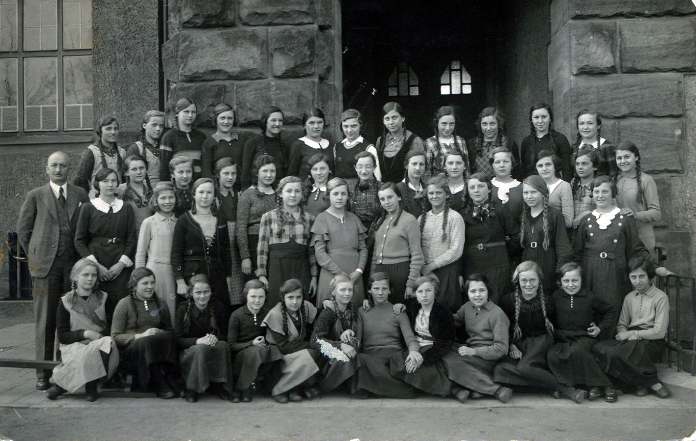 | Beschreibung | 7. Schulklasse in der Pestalozzischule, links im Bild: Lehrer Hr. Reichel, ca. 1936/37 | ||