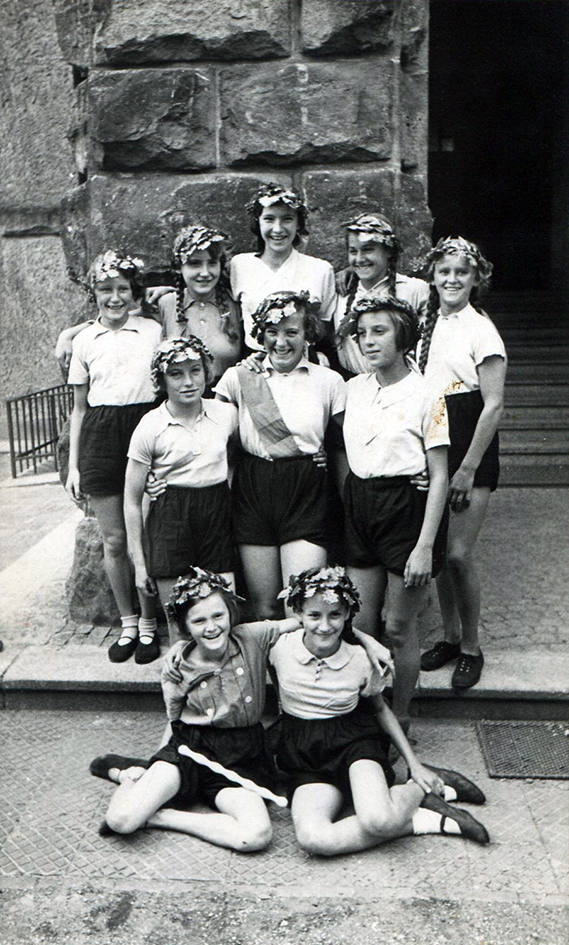 | Beschreibung | Siegerinnen der 100 m Staffel beim Schulwettbewerb auf dem Lohnert-Sportplatz, 1937 - 8. Schuljahr in der Pestalozzischule, links unten im Bild: Startläuferin Hedwig Gellinger mit Staffelstab | ||