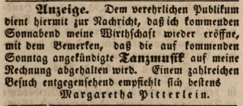 | Dateiinfo (Bild-Unterschrift und Info-Box, automatisch erstellt) | Zeitungsanzeige der Wirtin Margaretha Pitterlein, Februar 1848 Lizenz: noc-nc-1.0 | ||