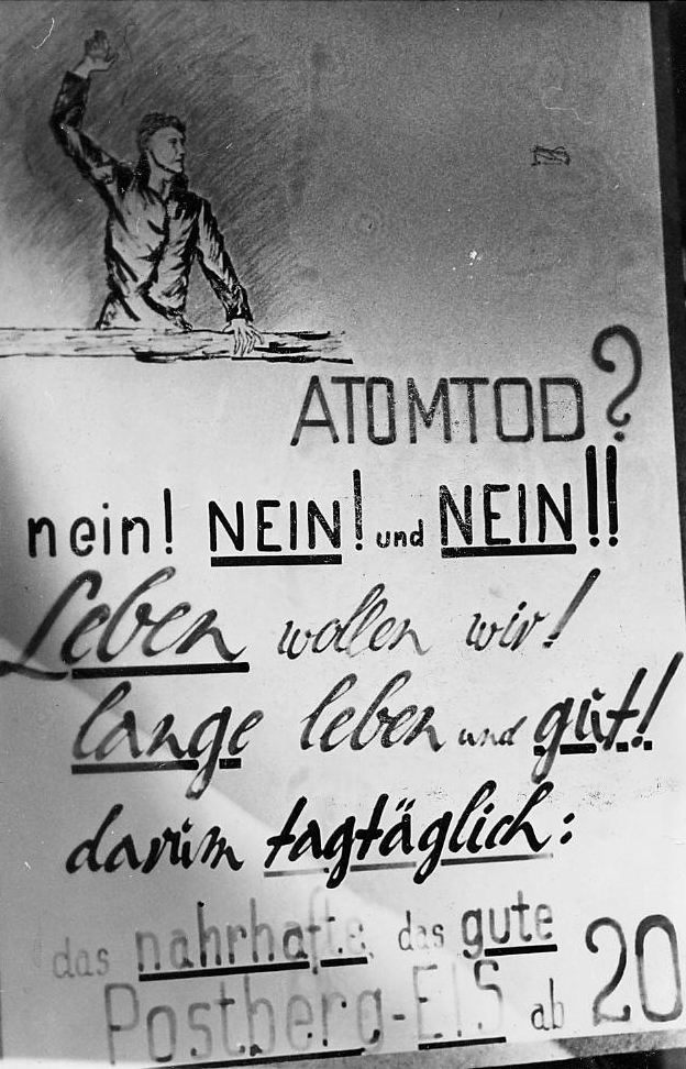BeschreibungWerbung des Postberg-Kiosk gegen den Atomtod - eine politische Parole der Friedensbewegung in den 1950er und 1960er Jahre, u.a. auch beim Ostermarsch, 1958