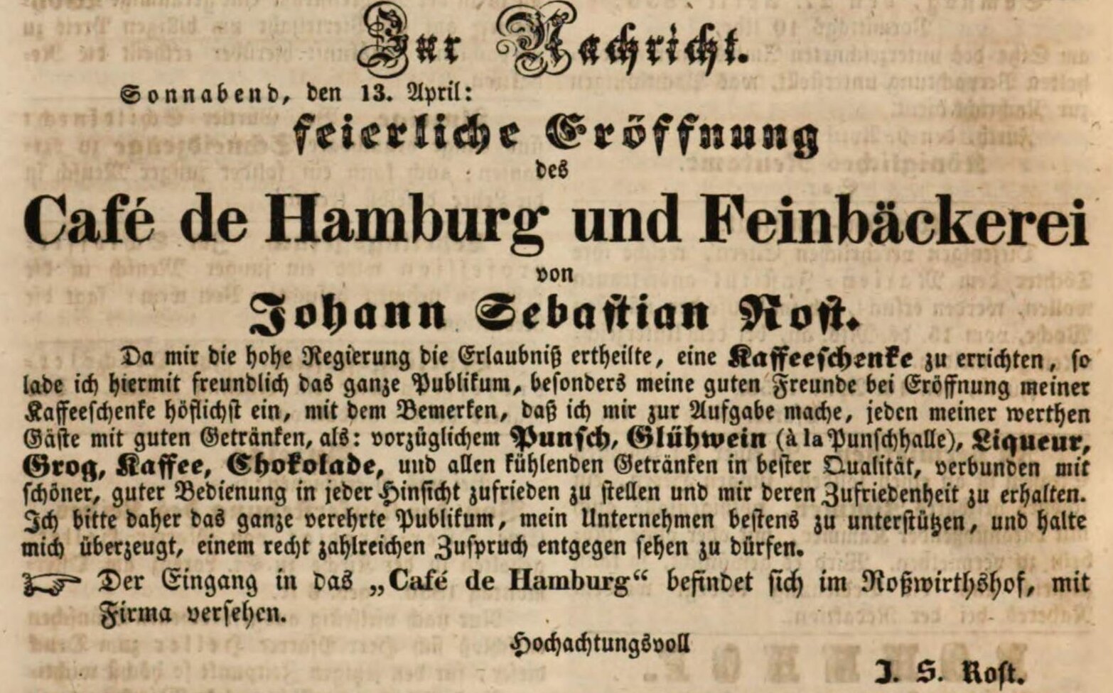 | Beschreibung | Zeitungsannonce von Johann Sebastian Rost anlässlich der Eröffnung seines Café de Hamburg, April 1850 | ||