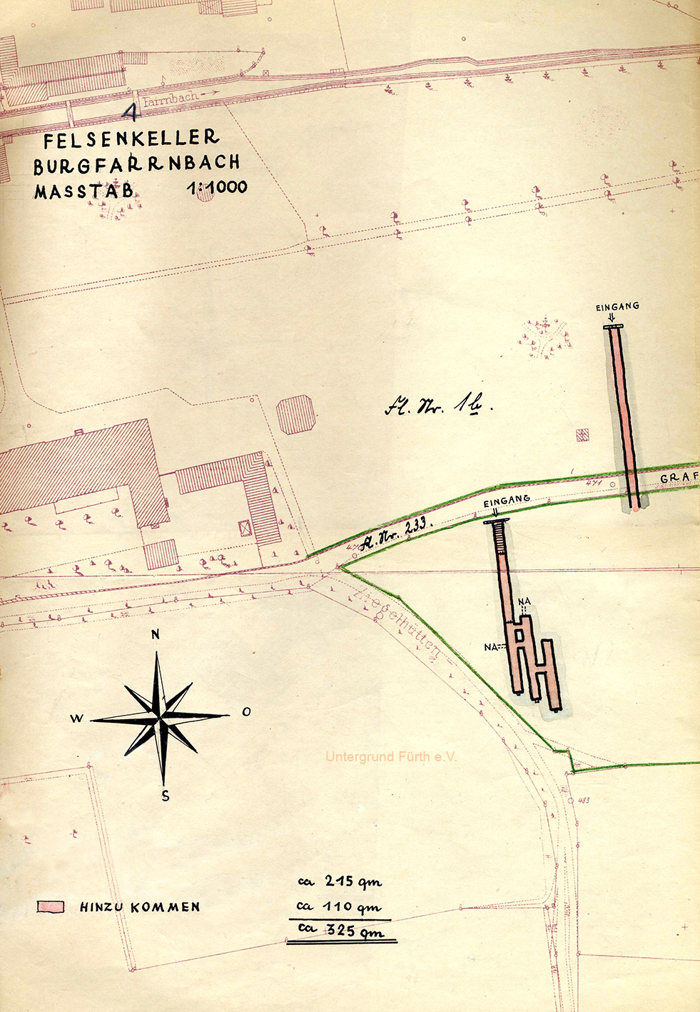 BeschreibungStollenanlage im Garten des Schloss Burgfarrnbach (Meierstollen), Plan von 1944.
