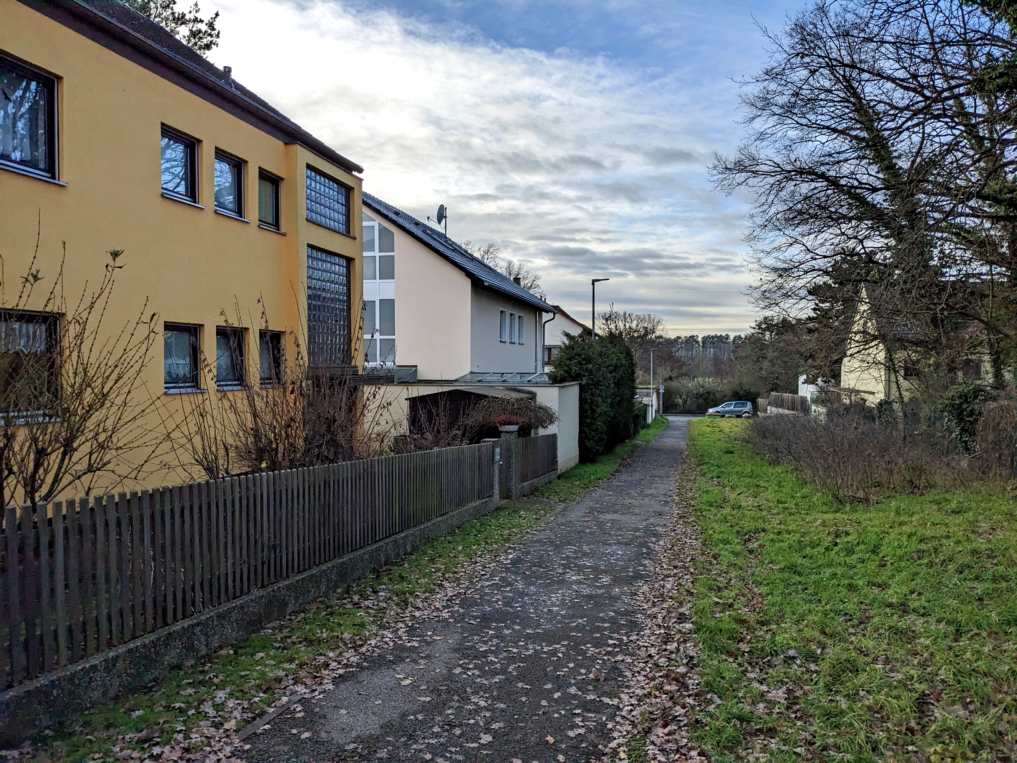 Blick Richtung Westen durch die Talpromenade in Stadeln, Dezember 2022 Urheber: Web Trefoil<br>Erstellungsdatum: 28. Dezember 2022<br>Lizenz: cc-by-sa-3.0