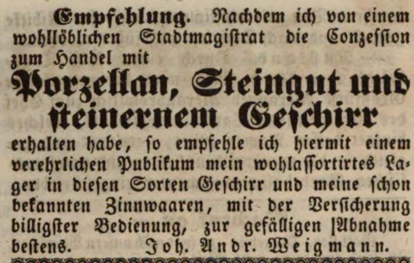 BeschreibungZeitungsannonce des Zinngießers Johann Andreas Weigmann, März 1845