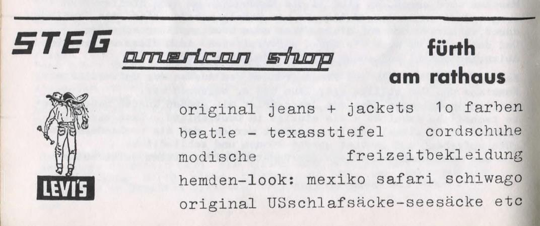 | Beschreibung | Werbung vom US Shop STEG Waren in der Schülerzeitung Die Pennalen Nr. 4 1968 | ||