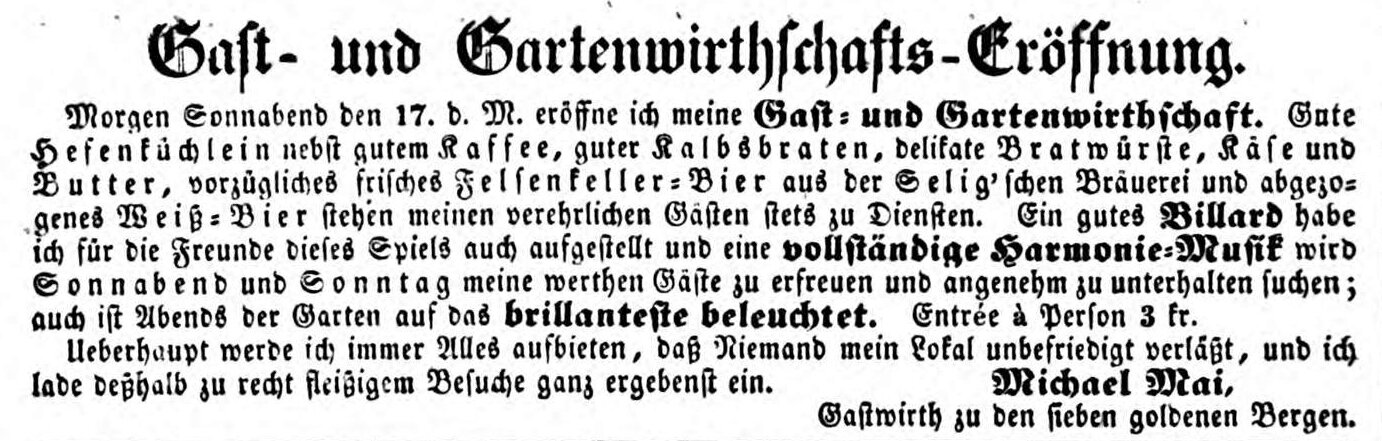 | Beschreibung | Zeitungsannonce für die Wirtschaft zu den "sieben goldenen Bergen", Juli 1852 | ||