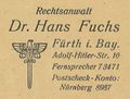 Lizenz: cc-by-sa-3.0Adressaufdruck des Rechtsanwalts Hans Fuchs auf einem Briefkuvert. Der erste Abschnitt der damaligen ... Adressaufdruck des Rechtsanwalts Hans Fuchs auf einem Briefkuvert. Der erste Abschnitt der damaligen Adolf-Hitler-Straße (Nr. 1-12) entspricht heute der Adresse Fürther Freiheit