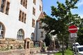 Viergeschossiger, asymmetrisch gegliederter Gruppenbau in Putz und Sandstein mit Satteldach und Schweifgiebeln, südlich zweigeschossiger Turnhallentrakt mit Schopfwalmdach; Vorgarten-Einfriedung, Sandsteinquadermauer mit gehäuseartigen Sandsteinpfeilern; sämtlich in historisierenden Formen, von Otto Holzer, 1905/06.