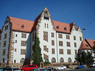 Der Schulbau nach Plänen von Stadtbaurat Otto Holzer wurde 1906 fertig gestellt und bezogen. Das im historisierenden Stil mit Jugendstilelementen erbaute Gebäude vereinigt Elemente des Heimatstils (hofseitig Fachwerkgiebel), der deutschen Renaissance und des damals von Theodor Fischer in München entwickelten reformierten Schulbaus. Die Wuchtigkeit des Gebäudes wird durch die hohen Schweifgiebel und die Rustikaquader an den Gebäudekanten betont. Die Kosten für Bau und Inneneinrichtung beliefen sich zur Bauzeit auf 360.000 RM, ohne die Kosten des Baugrundstückes.