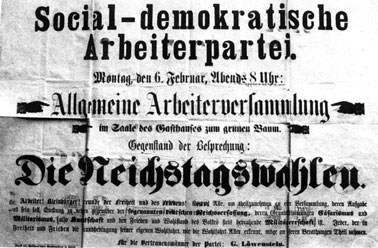 | aktuell | 23:53, 19. Mai 2013 | 378 × 248 (36 KB) | Kasa Fue (Diskussion | Beiträge) | {{Bild |Genre=Fotografien; historische Dokumente |Attribut=Zeitung |Wert=SPD |Quelle=Plakat zu einer Arbeiterversammlung |Beschreibung=Aufruf zu einer Arbeiterversammlung anlässlich der bevorstehenden Reichtagswahlen 1870. }} |