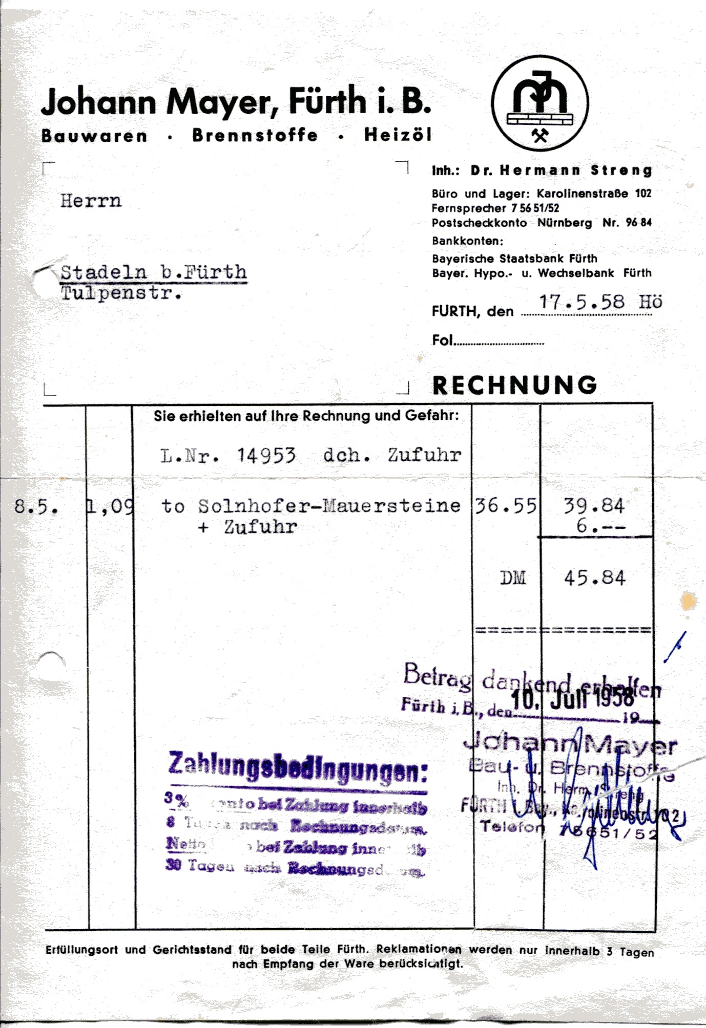 ({{Bild}} Rechnung der Bauwarenfirma Johann Mayer in der karolinenstraße 102 von 1958.) |