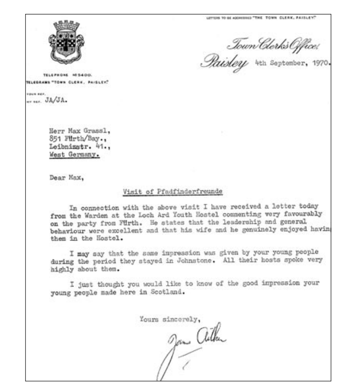 | Beschreibung | Dankschreiben des Stadtdirektors von Paisley an Max Graßl Deutsche Pfadfinderschaft St. Georg Fürth für den Besuch und die Betreuung der schottischen Pfadfindergruppe "Boy´s Brigade Paisley" vom 12.-22.08.1970 in Fürth | ||