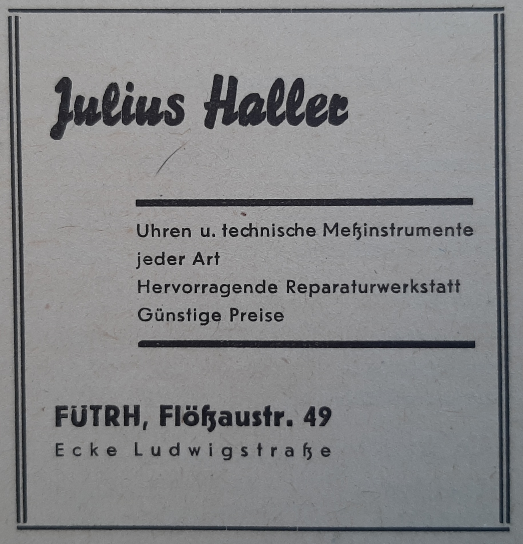 | Beschreibung | Werbeanzeige des Uhrmachermeisters Julius Haller, 1949 | ||
