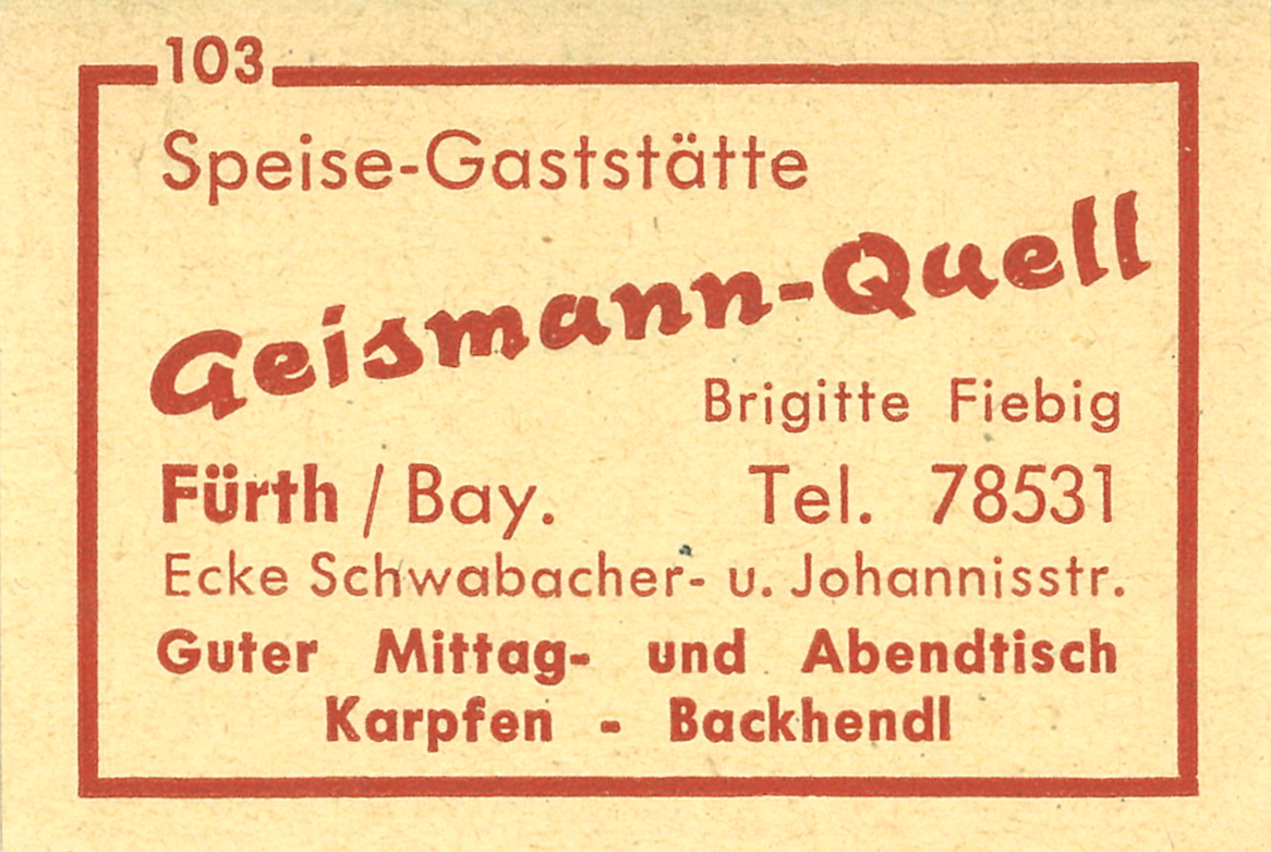 Zündholzschachtel-Etikett der ehemaligen Gaststätte Geismann Quell, um 1965 Lizenz: cc-by-sa-3.0
