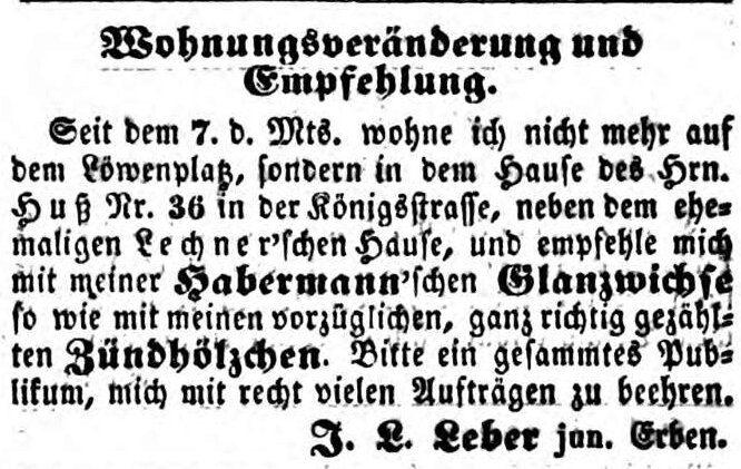 |Beschreibung=Zeitungsanzeige der J. L. Leber jun. Erben, Mai 1852 | |||