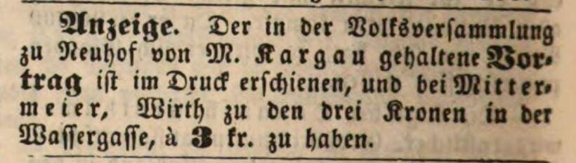 | Beschreibung | Anzeige für Moritz Kargaus gedruckten Vortrag, Fürther Tagblatt 22. September 1848 | ||
