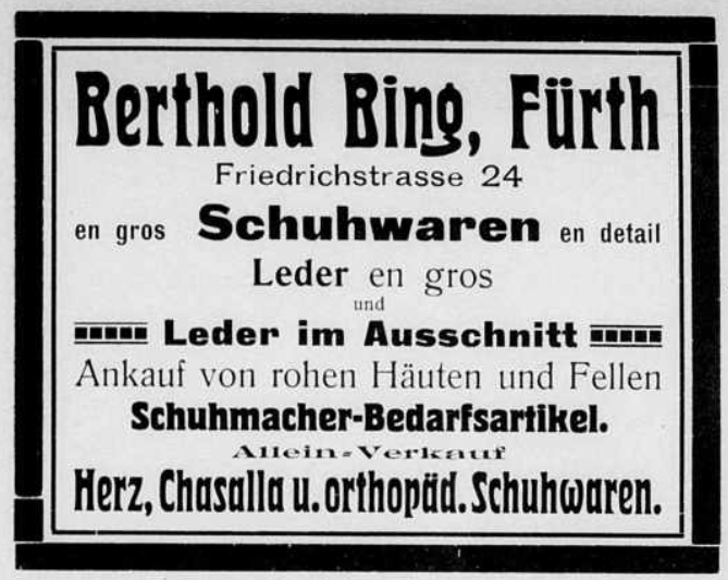 |Beschreibung=Werbeanzeige Schuhwaren Berthold (Benedikt) Bing, 1913 | |||