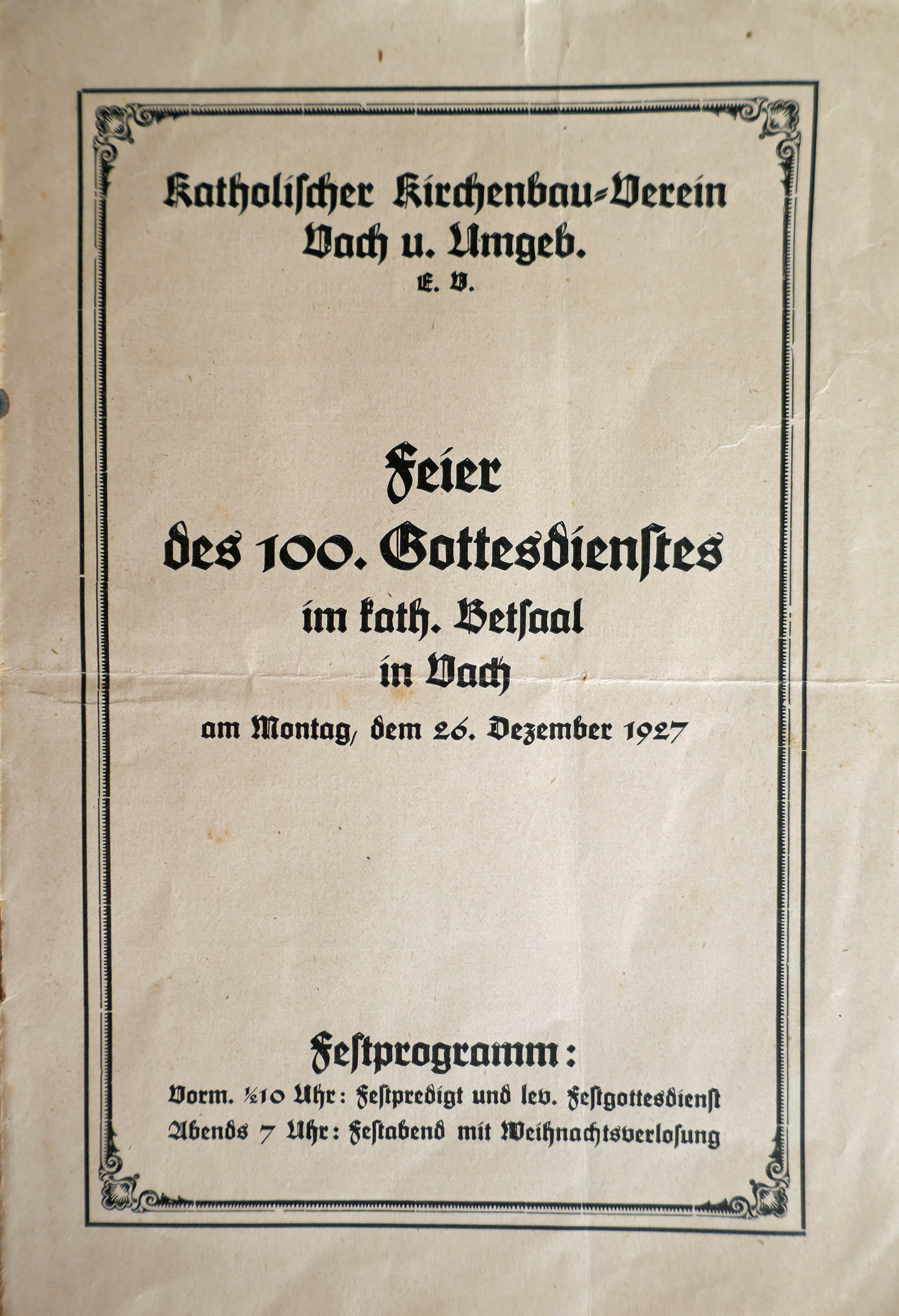 | Beschreibung | Feier zum 100. Gottesdienst der kath. Gemeinde im Gasthof Reißner-Egerer in Vach, 1927 | ||