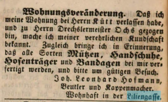 | Beschreibung | Zeitungsannonce des Beutlers J. L. Hofmann in der Liliengasse, Juni 1848 | ||