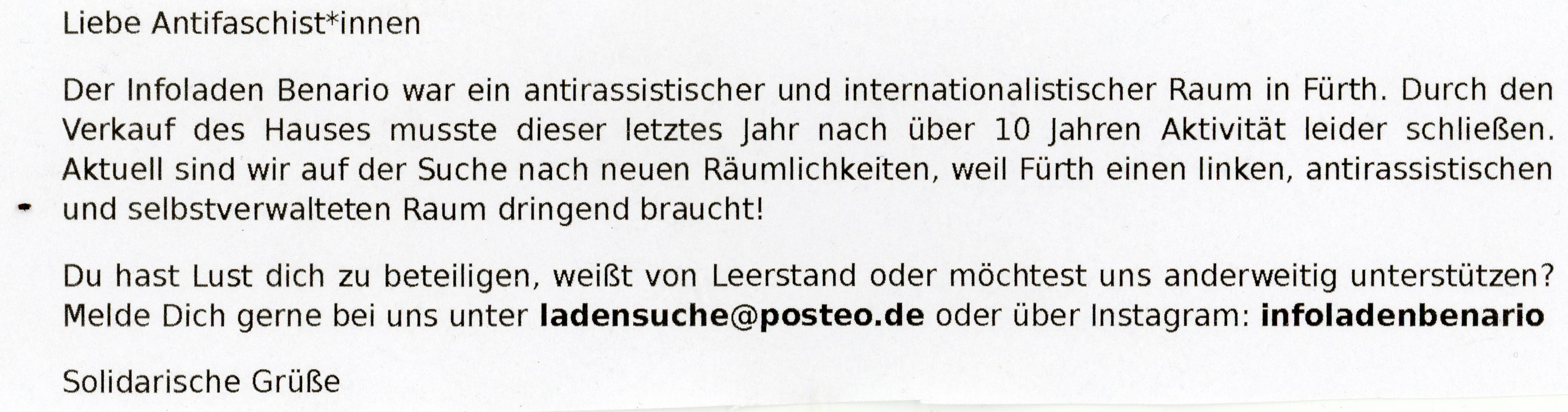 BeschreibungFlyer bzw. Unterstützungsaufruf des Infoladens Benario für neue Räumlichkeiten, April 2025