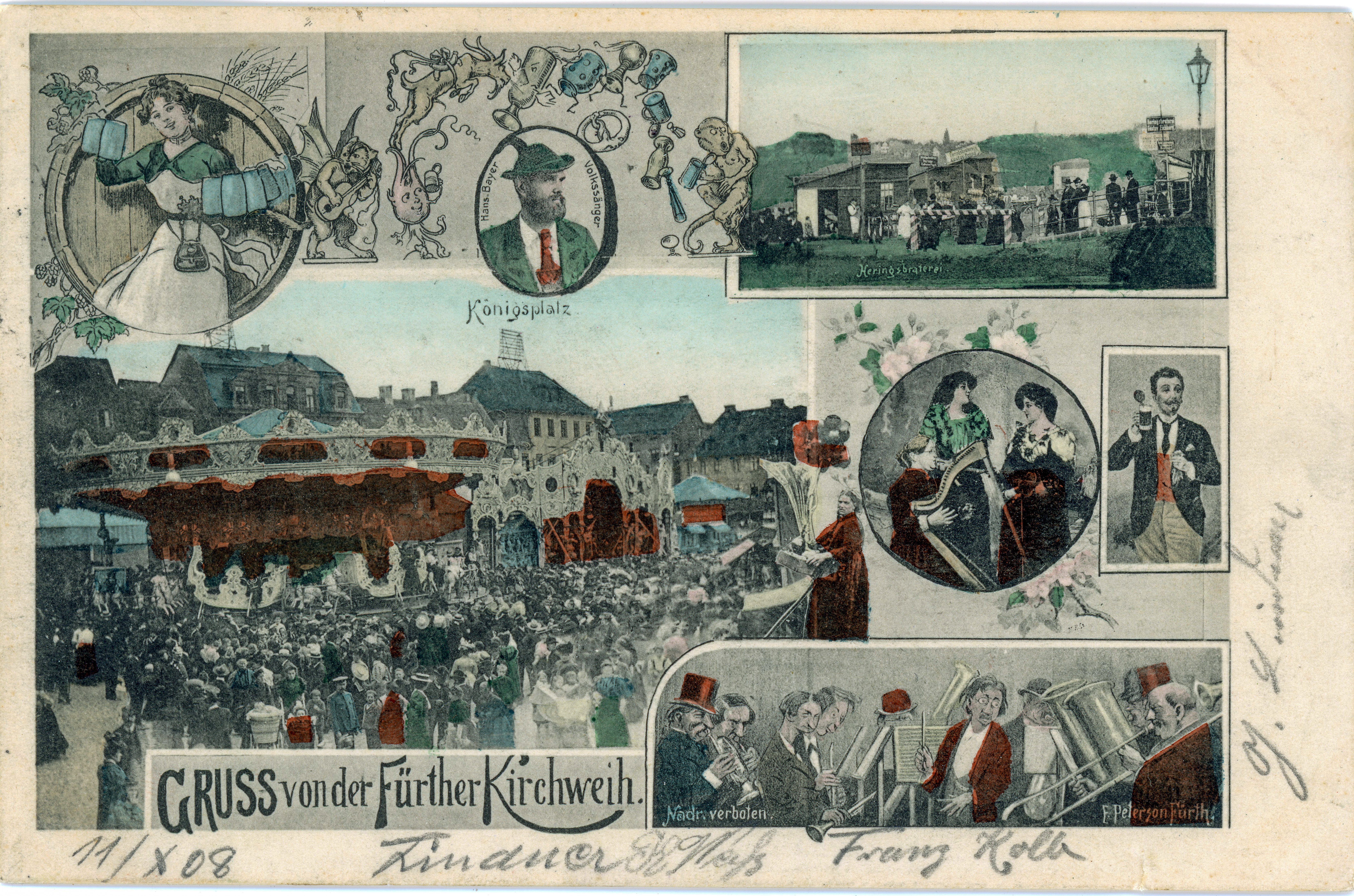 | Beschreibung | Gruß von der Fürther Kirchweih, historische Ansichtskarte mit Fotografien vom Königsplatz und Heringsbraterdorf, koloriert, gel. 1905 | ||