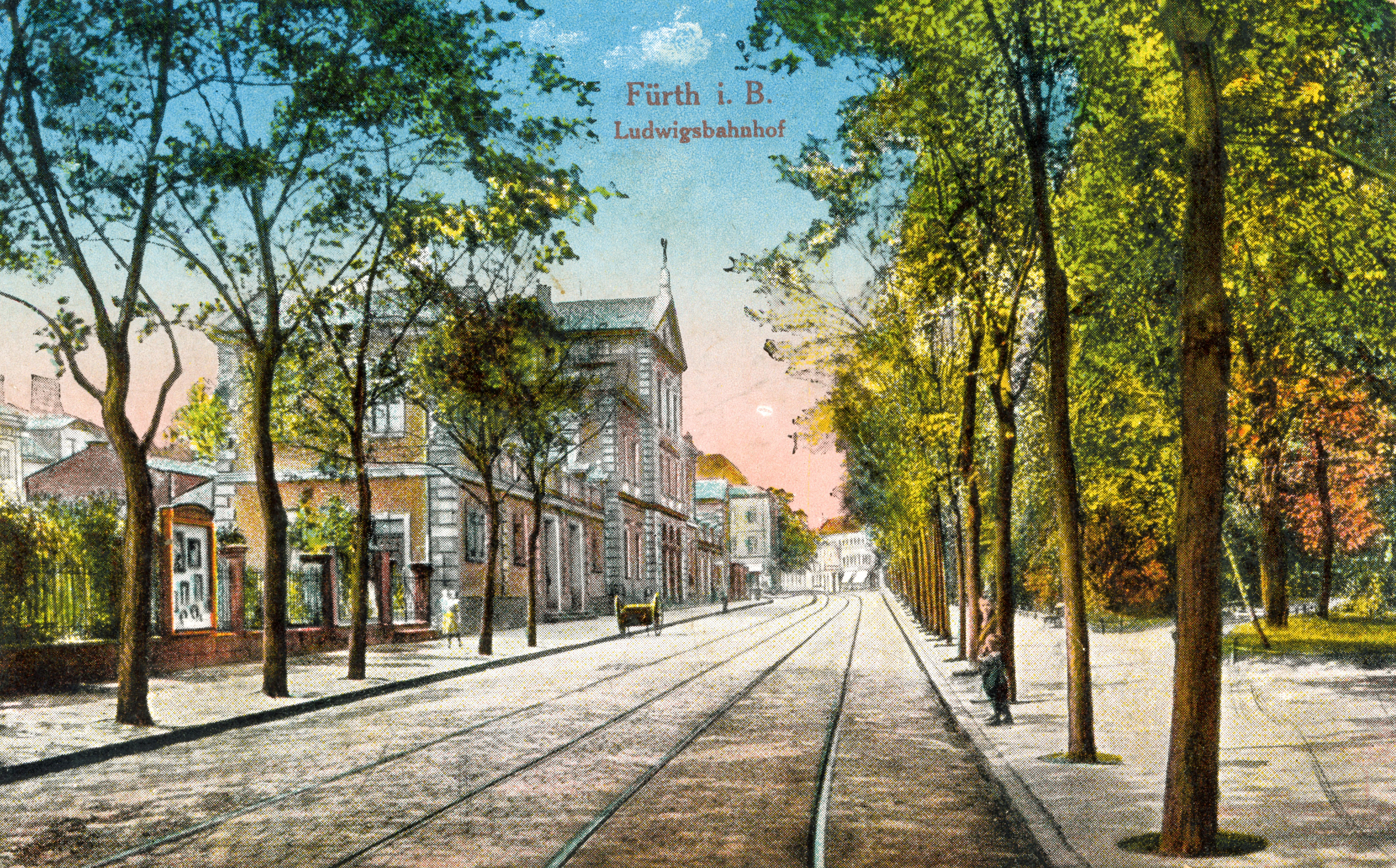 |Beschreibung=Blick in die heutige Rudolf-Breitscheid-Straße mit Straßenbahnschienen, links der ehem. Ludwigsbahnhof, gel. Feb 1918 | |||