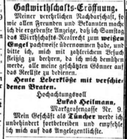 | 17:37, 30. Jul. 2020 | Wirtschaftseröffg.-Heilmann 1870.png (Datei) | 185 KB | {{Bild}}Eröffnung der Gastwirtschaft "Zum weißen Engel" des Pächters Lukas Heilmann, Fürther Tagblatt vom 29. Mai 1870 | 1 | |
