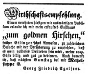 | 11:58, 17. Okt. 2021 | Fürther Tagblatt 1851-11-21.png (Datei) | 290 KB | {{Bild}}Anzeige über den Erwerb des Gasthauses "Zum Goldnen Hirschen" durch Georg Friedrich Egelseer, 1851 | 1 | |