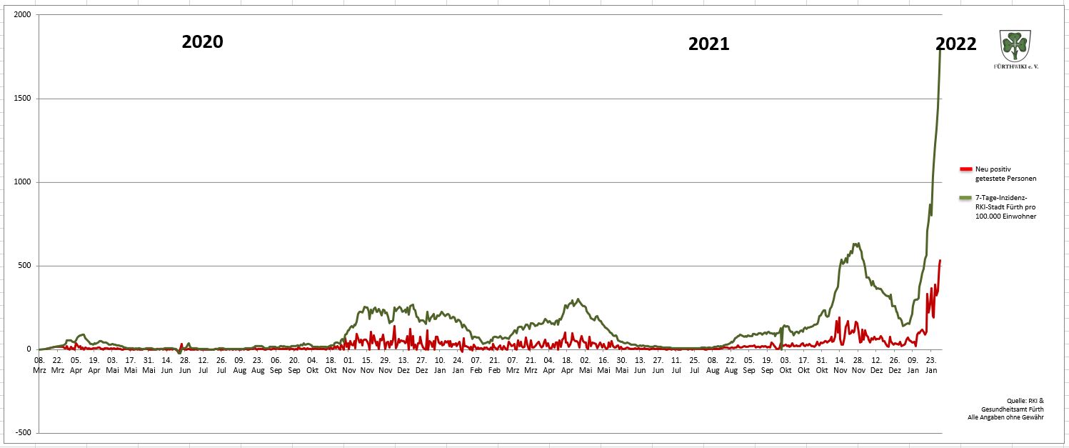 - Das Diagramm setzt sich aus den Daten des Gesundheitsamtes Fürth und den Zahlen des RKI zusammen.