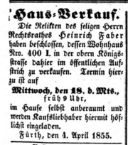 | 15:45, 30. Mai 2022 | 1855-04-10 FÜ-Tagblatt Hausverkauf Faber.png (Datei) | 179 KB | {{Bild}}Anzeige über Versteigerung des Wohnhauses Faber; Fürther Tagblatt vom 10. April 1855 | 1 | |