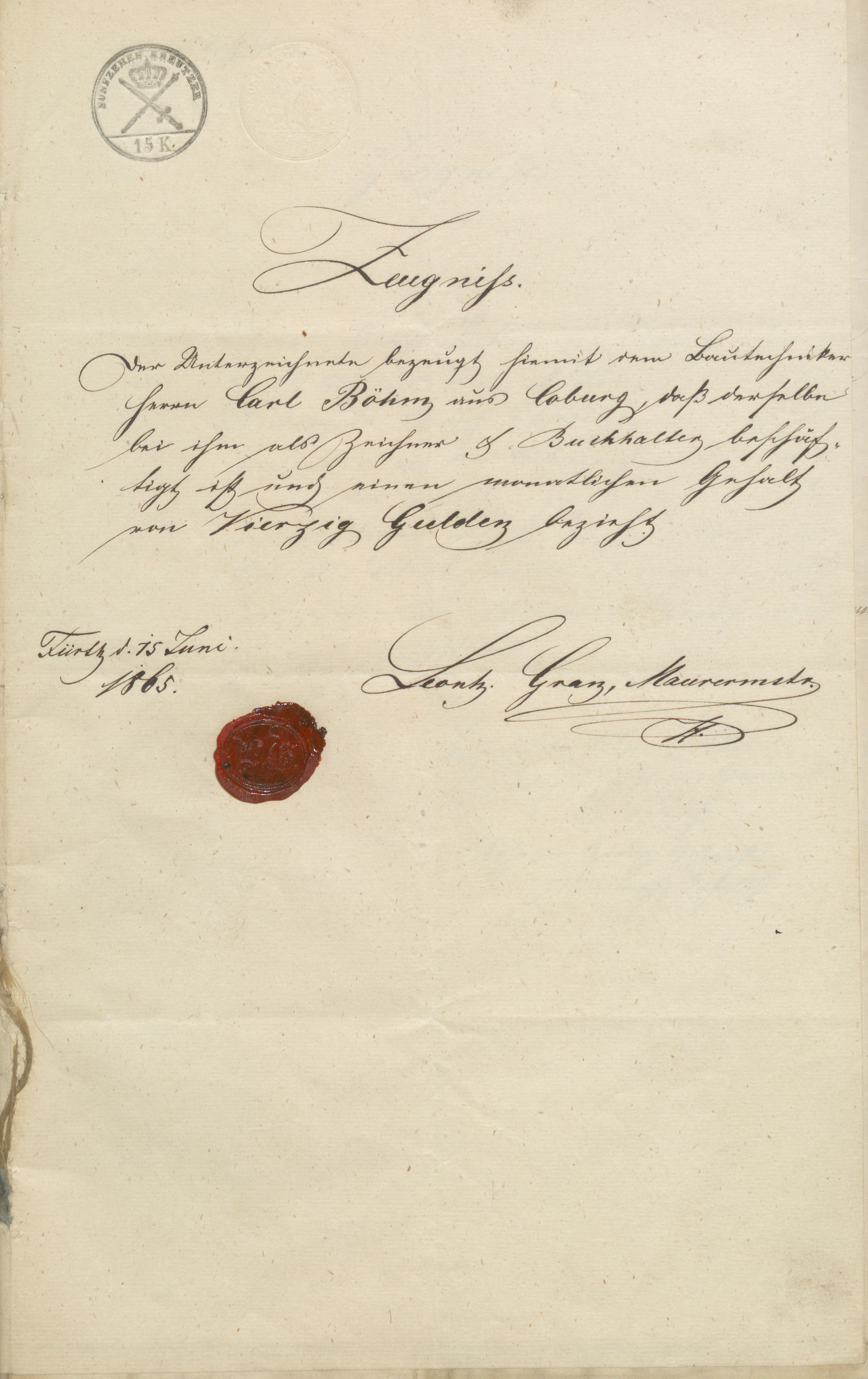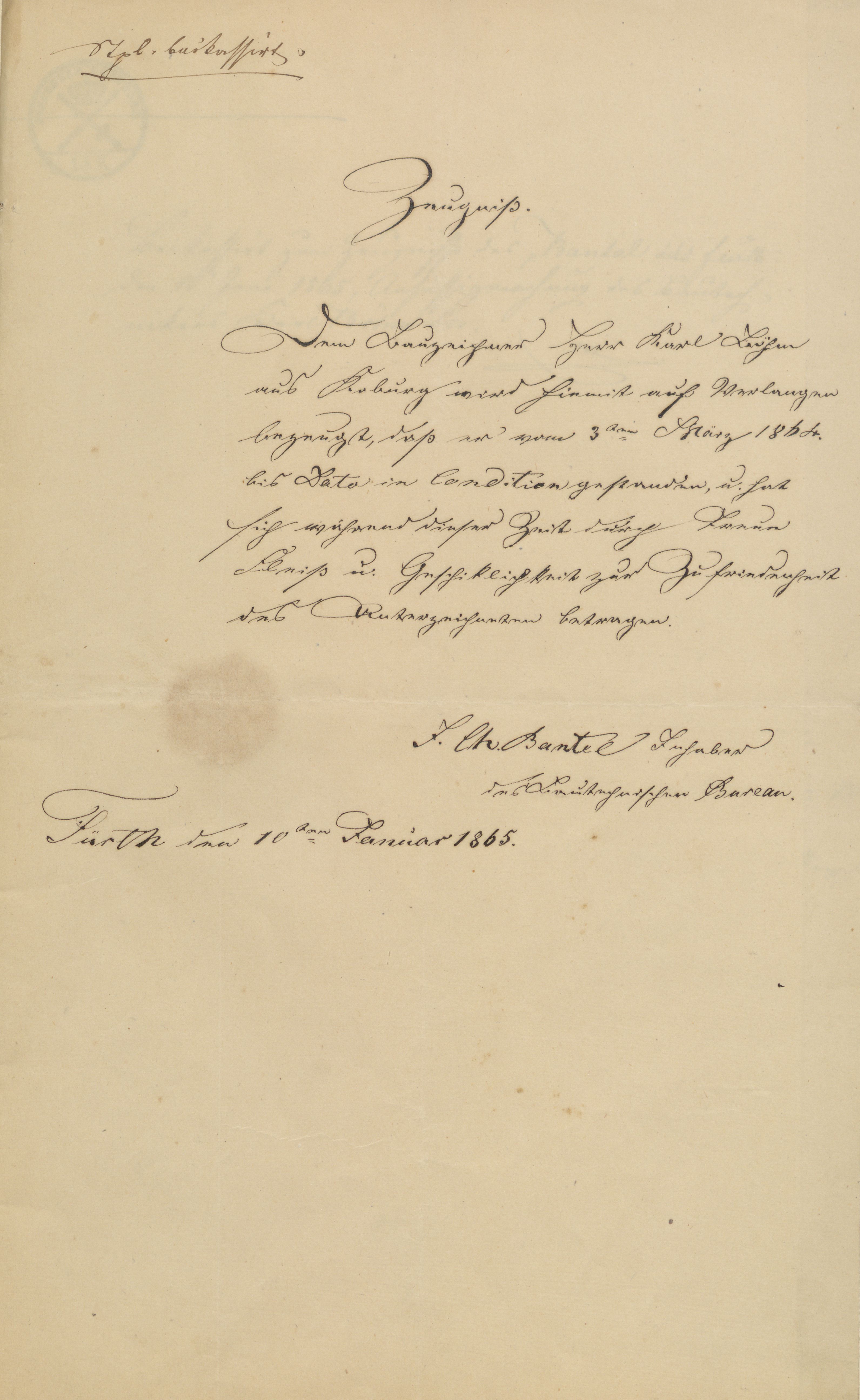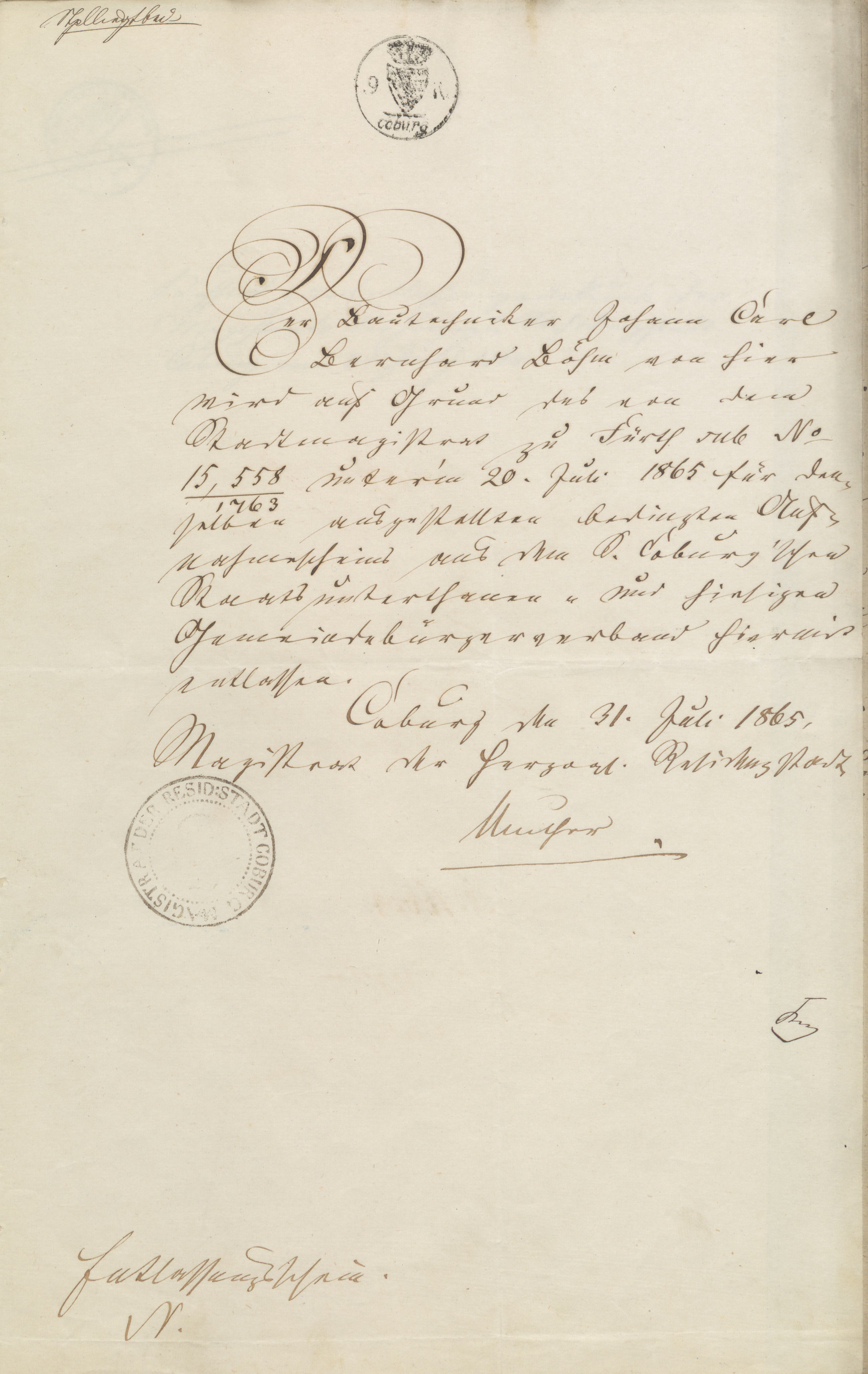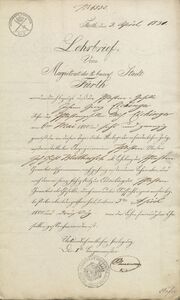 | 16:53, 14. Okt. 2024 | Fach 18a-B 416 3.jpg (Datei) | 1,99 MB | {{Bild}}Entlassungsschein für Carl Böhm aus herzogl. coburgischen Staat und Gemeindeverband der Stadt Coburg, Juli 1865; Veröffentlichungsgenehmigung Stadtarchiv Fürth vom 09.10.2024 | 1 | |