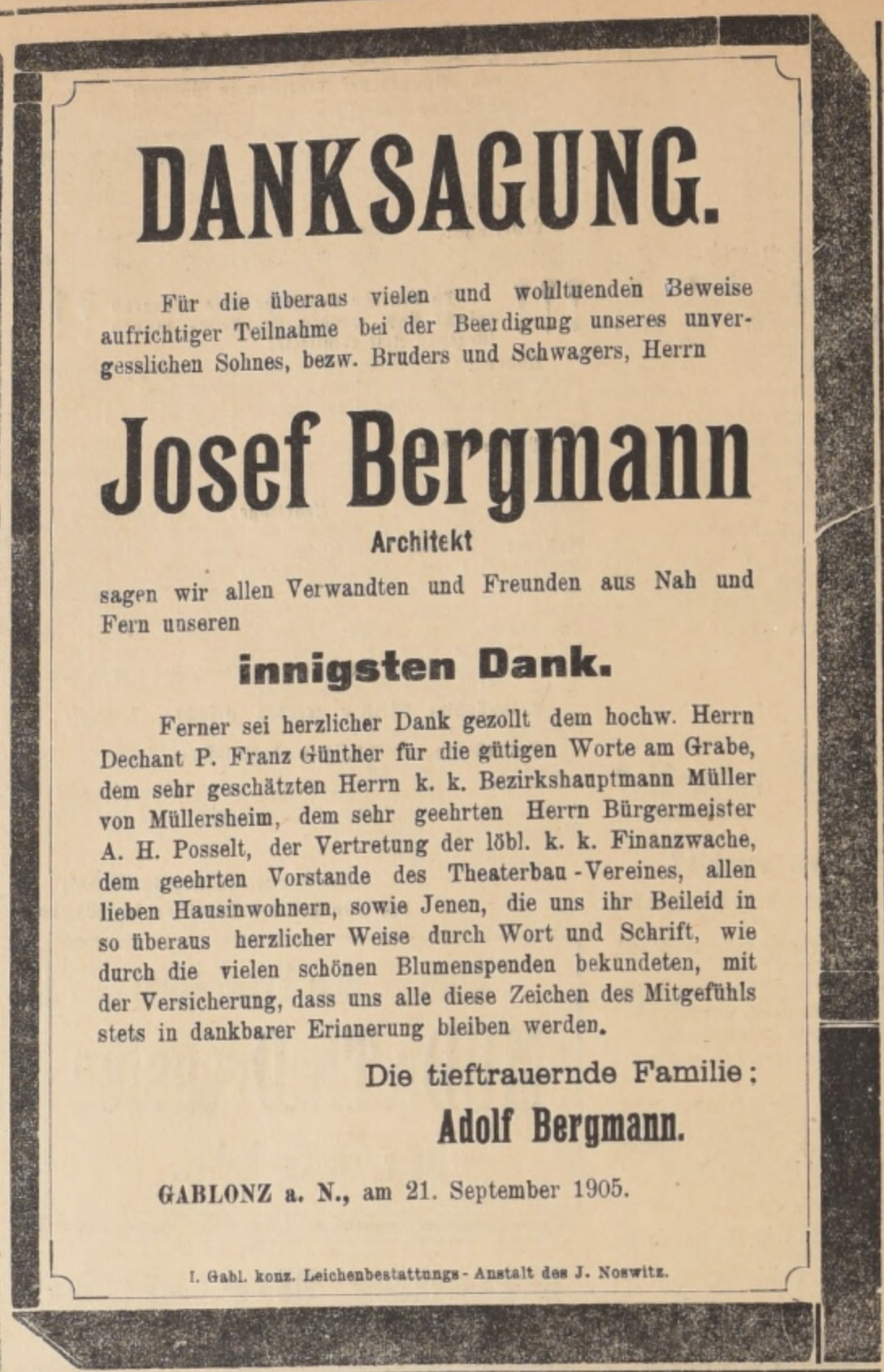 | 09:29, 23. Sep. 2024 | Gablonzer Tagblatt 1905-09-19 Traueranzeige.png (Datei) | 2,91 MB | {{Bild}}Traueranzeige für Josef Bergmann, Gablonzer Tagblatt vom 19. Sept. 1905 | 1 | |