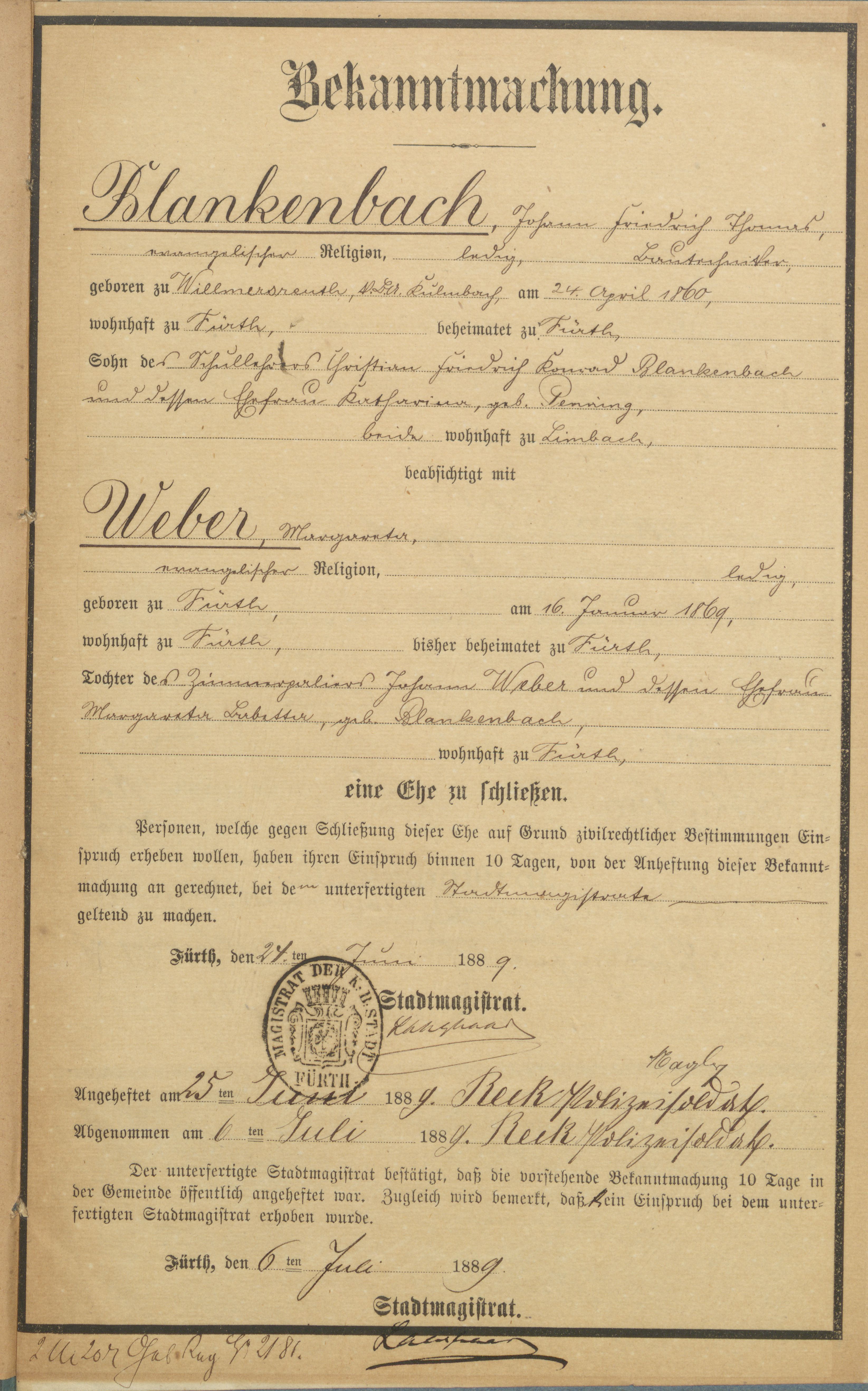 | 17:52, 18. Aug. 2024 | Fach 18 a B-1034 Bkntmg.jpg (Datei) | 2,64 MB | {{Bild}}Bekanntmachung zur Eheschließung Blankenbach/Weber, Juni 1889; Veröffentlichungsgenehmigung Stadtarchiv Fürth vom 01.08.2024 | 1 | |