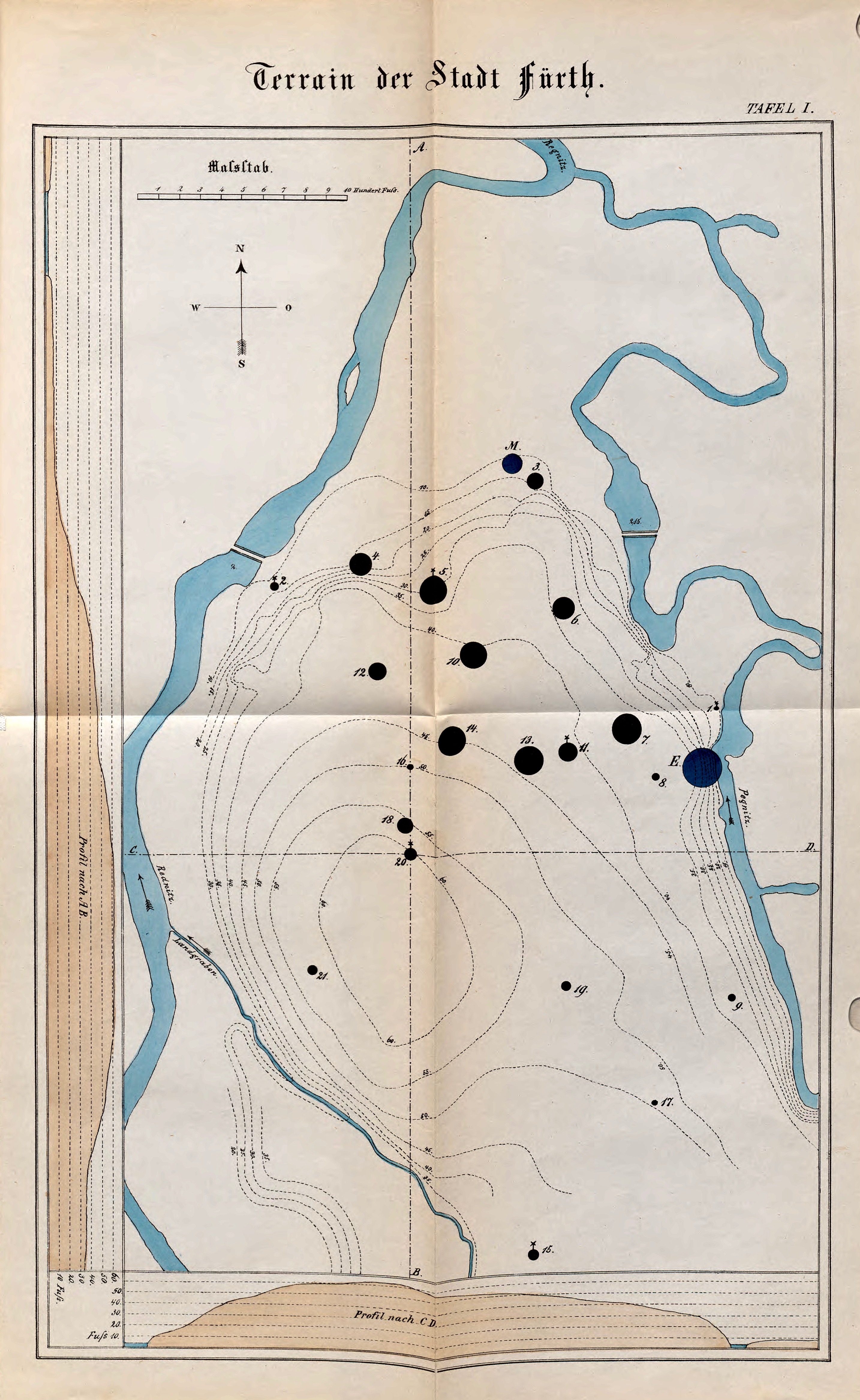 | Beschreibung | Tafel I: Charakteristik der Erdoberfläche mit Höhenlinien (Abstand 5 Fuss, Bezugsniveau ist eine Horizontalebene, welche um 2 Fuss tiefer liegt, als der (mittlere) Wasserspiegel der Rednitz an der sog. unteren Brücke) mit Eintrag der untersuchten Brunnen | ||