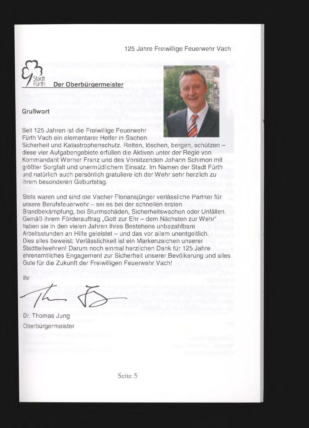 Seit 125 Jahren ist die Freiwillige Feuerwehr Fürth Vach ein elementarer Helfer in Sachen Sicherheit und Katastrophenschutz. Retten, löschen, bergen, schützen diese vier Aufgabengebiete erfüllen die Aktiven unter der Regie von Kommandant Werner Franz und des Vorsitzenden Johann Schimon mit größter Sorgfalt und unermüdlichem Einsatz. Im Namen der Stadt Fürth und natürlich auch persönlich gratuliere ich der Wehr sehr herzlich zu ihrem besonderen Geburtstag.