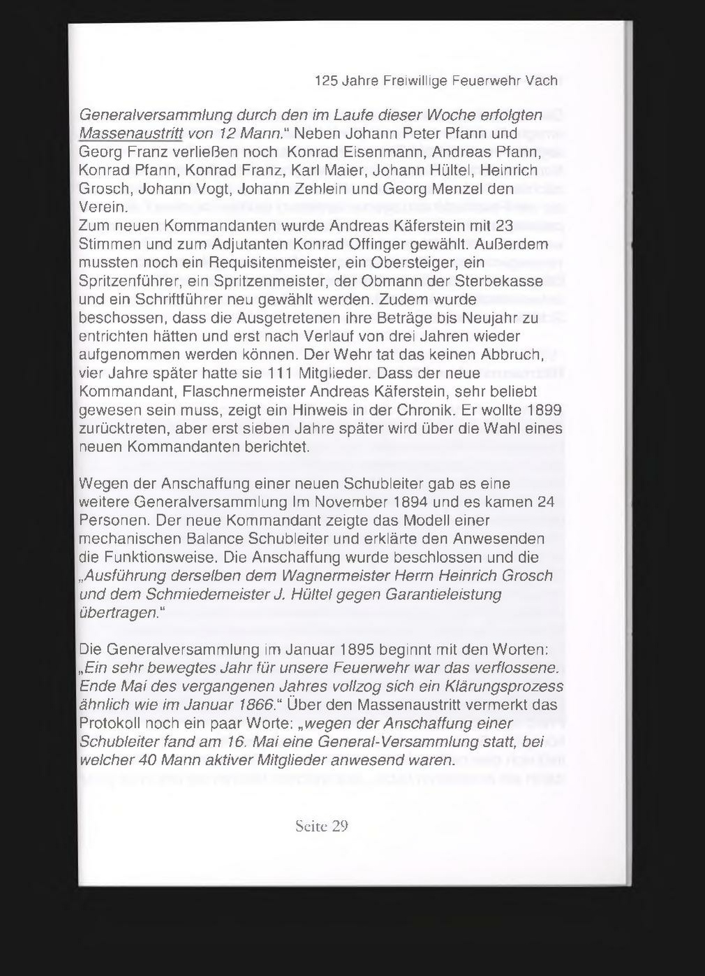 Generalversammlung durch den im Laufe dieser Woche erfolgten Massenaustritt von 12 Mann.“ Neben Johann Peter Pfann und Georg Franz verließen noch Konrad Eisenmann, Andreas Pfann, Konrad Pfann, Konrad Franz, Karl Maier, Johann Hültel, Heinrich Grosch, Johann Vogt, Johann Zehlein und Georg Menzel den Verein. Zum neuen Kommandanten wurde Andreas Käferstein mit 23 Stimmen und zum Adjutanten Konrad Offinger gewählt. Außerdem mussten noch ein Requisitenmeister, ein Obersteiger, ein Spritzenführer, ein Spritzenmeister, der Obmann der Sterbekasse und ein Schriftführer neu gewählt werden. Zudem wurde beschossen, dass die Ausgetretenen ihre Beträge bis Neujahr zu entrichten hätten und erst nach Verlauf von drei Jahren wieder aufgenommen werden können. Der Wehr tat das keinen Abbruch, vier Jahre später hatte sie 111 Mitglieder. Dass der neue Kommandant, Flaschnermeister Andreas Käferstein, sehr beliebt gewesen sein muss, zeigt ein Hinweis in der Chronik. Er wollte 1899 zurücktreten, aber erst sieben Jahre später wird über die Wahl eines neuen Kommandanten berichtet. Wegen der Anschaffung einer neuen Schubleiter gab es eine weitere Generalversammlung Im November 1894 und es kamen 24 Personen. Der neue Kommandant zeigte das Modell einer mechanischen Balance Schubleiter und erklärte den Anwesenden die Funktionsweise. Die Anschaffung wurde beschlossen und die ״Ausführung derselben dem Wagnermeister Herrn Heinrich Grosch und dem Schmiedemeister J. Hültel gegen Garantieleistung übertragen.“ Die Generalversammlung im Januar 1895 beginnt mit den Worten: ״Ein sehr bewegtes Jahr für unsere Feuerwehr war das verflossene. Ende Mai des vergangenen Jahres vollzog sich ein Klärungsprozess ähnlich wie im Januar 1866.“ Über den Massenaustritt vermerkt das Protokoll noch ein paar Worte: ״wegen der Anschaffung einer Schubleiter fand am 16. Mai eine General-Versammlung statt, bei welcher 40 Mann aktiver Mitglieder anwesend waren.